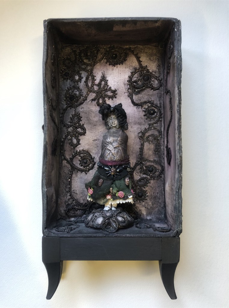 POUPÉE N°557 – Boîte – Céramique – Broderie – Perles. 32 cm x 15 cm.