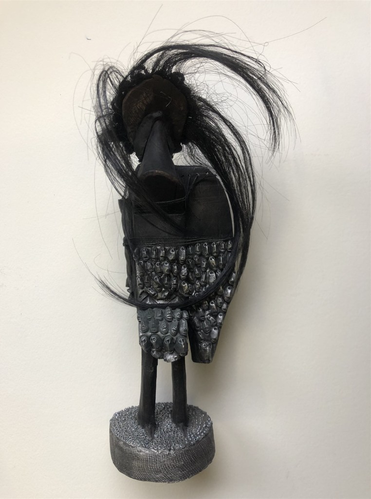 POUPÉE N°571. Verso – Poupée en bois sur socle – Crâne – Céramique – Perles – Cheveux. 23 cm x 7 cm.