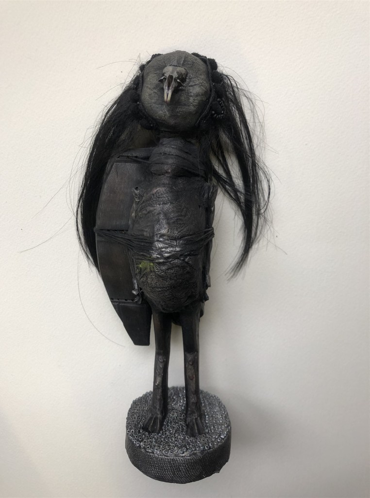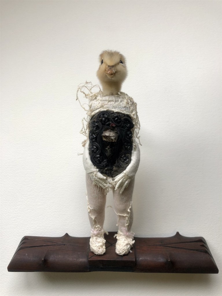 POUPÉE N°587 – Tissus – Perles – Broderie – Tête de caneton – Petit crâne – Socle bois 21 cm x 4 cm. Poupée 20 cm x 5 cm.