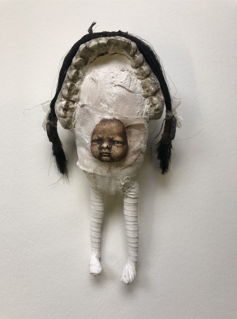 POUPÉE N°572 -Tissus – Céramique – Moulé dentaire – Cheveux. 16 cm x 6 cm.