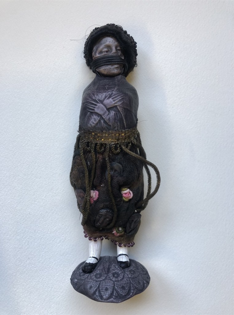 POUPÉE N°504 – Tissus – Céramique – Perles – Broderie. 20 cm X 5 cm.
