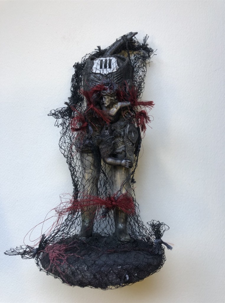 POUPÉE N°577 – Tissus – Filet noir – Fils de soie rouge – Céramique – Socle. 22 cm x 10 cm.
