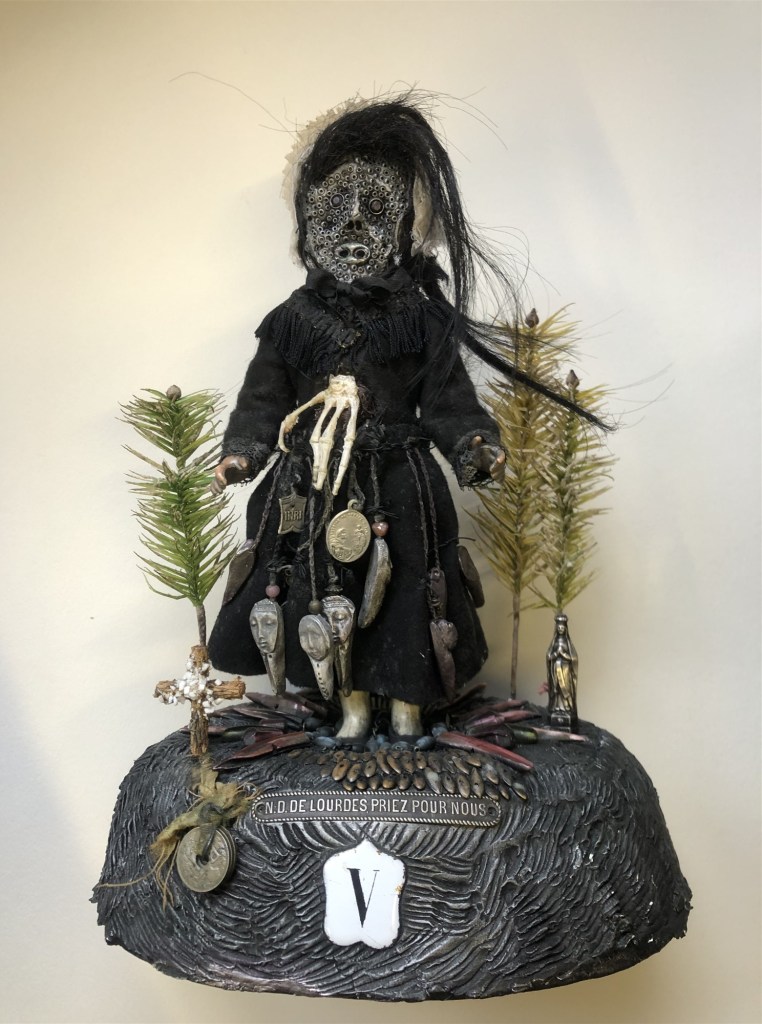 POUPÉE N°584. Tissus – Céramique – Médailles – Perles – Sapins – Doigts de crapaud taureau – Socle ouvragé. 28 cm x 21 cm.