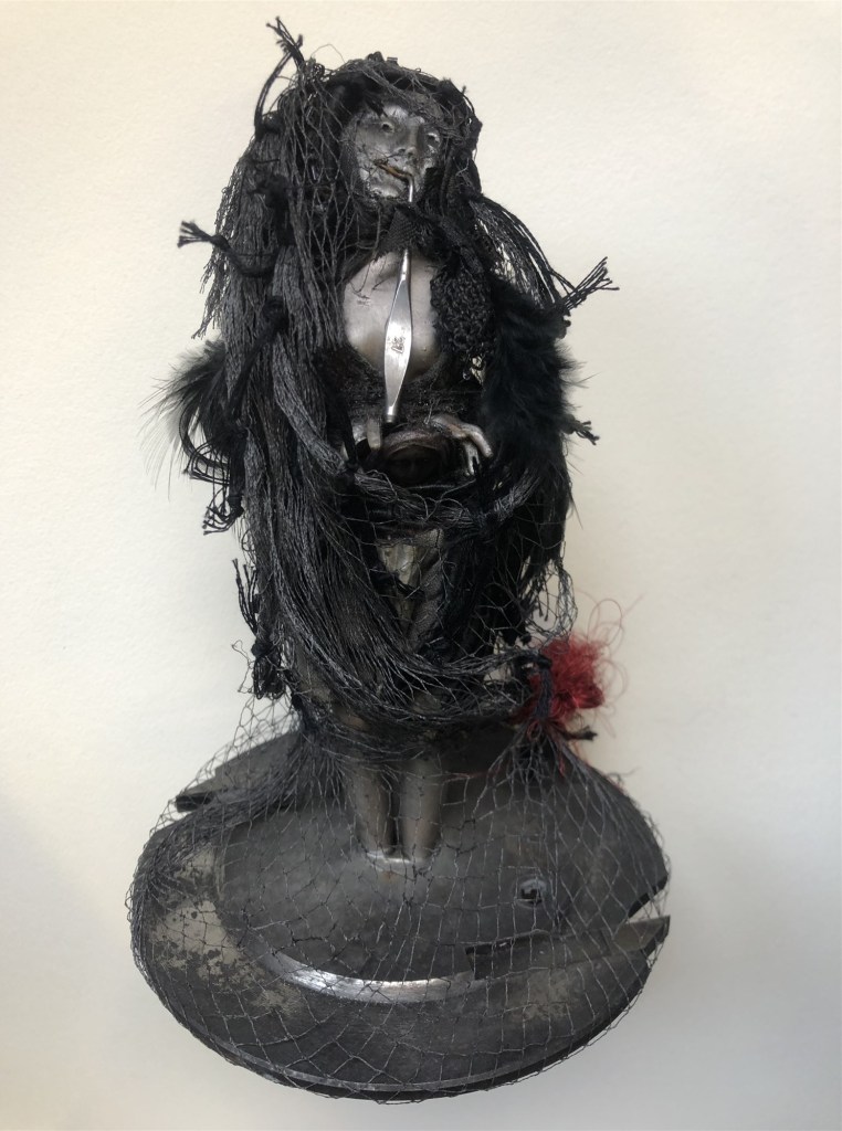 POUPÉE N°596 – Tissus – Céramique – Aiguilles – Fils de soie rouge – Médaille – Perles – Socle acier. 18 cm x 5 cm.