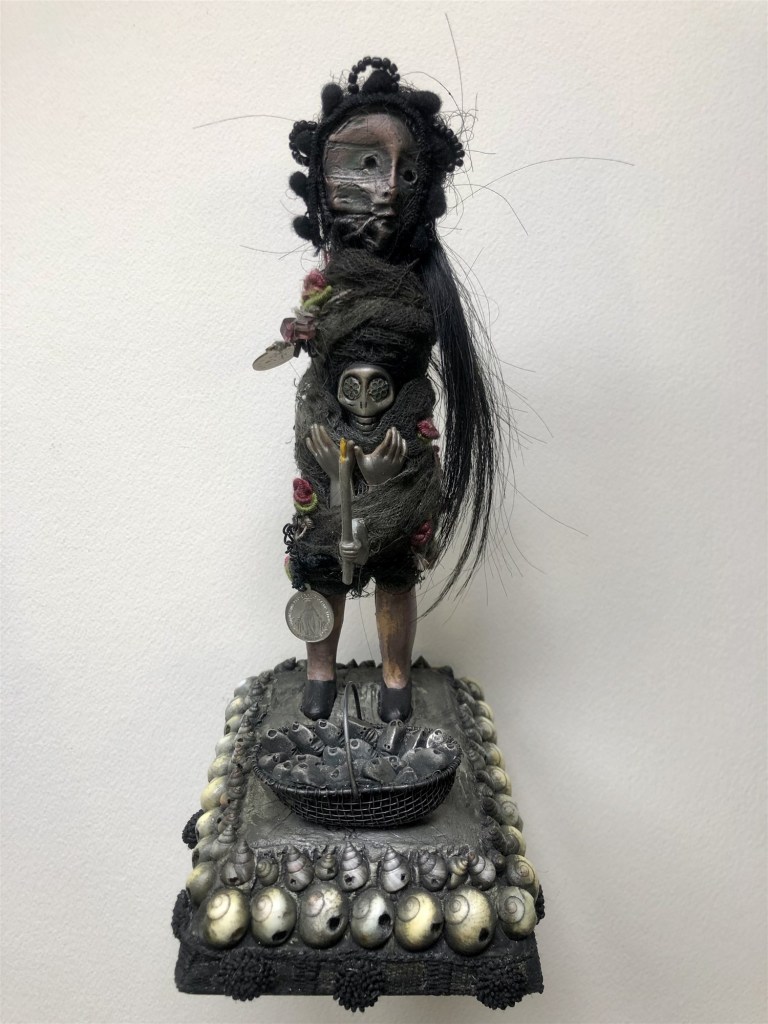 POUPÉE N°586 – Tissus – Céramique – Plumes – Perles – Petit panier en fer – Coquillages – Broderie – Socle en acier 11 cm x 8 cm. Poupée 17 cm x 5 cm.