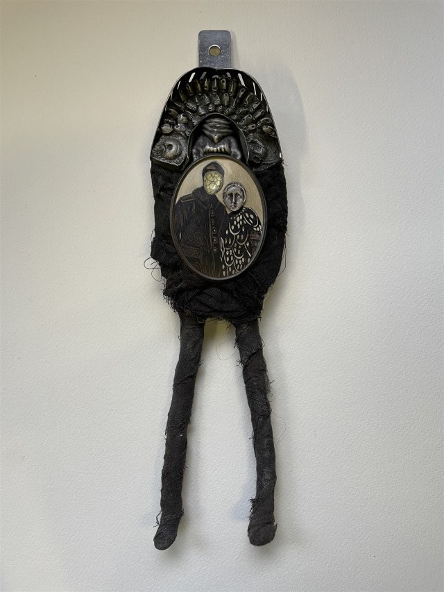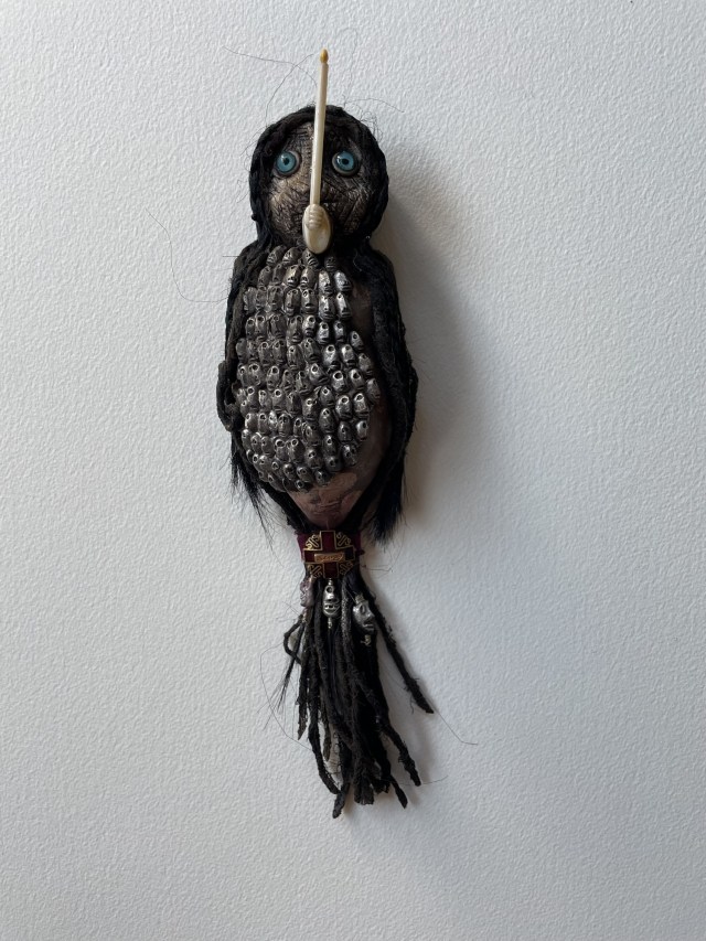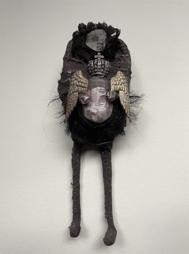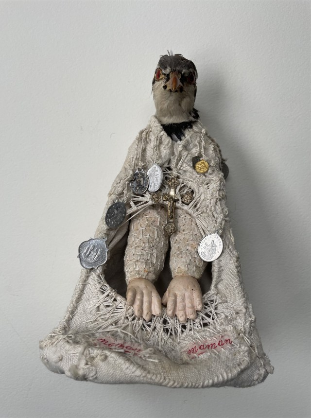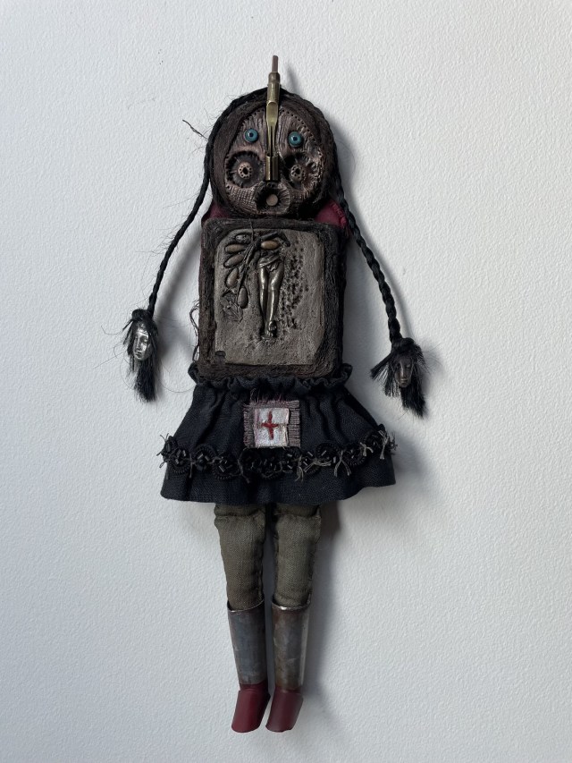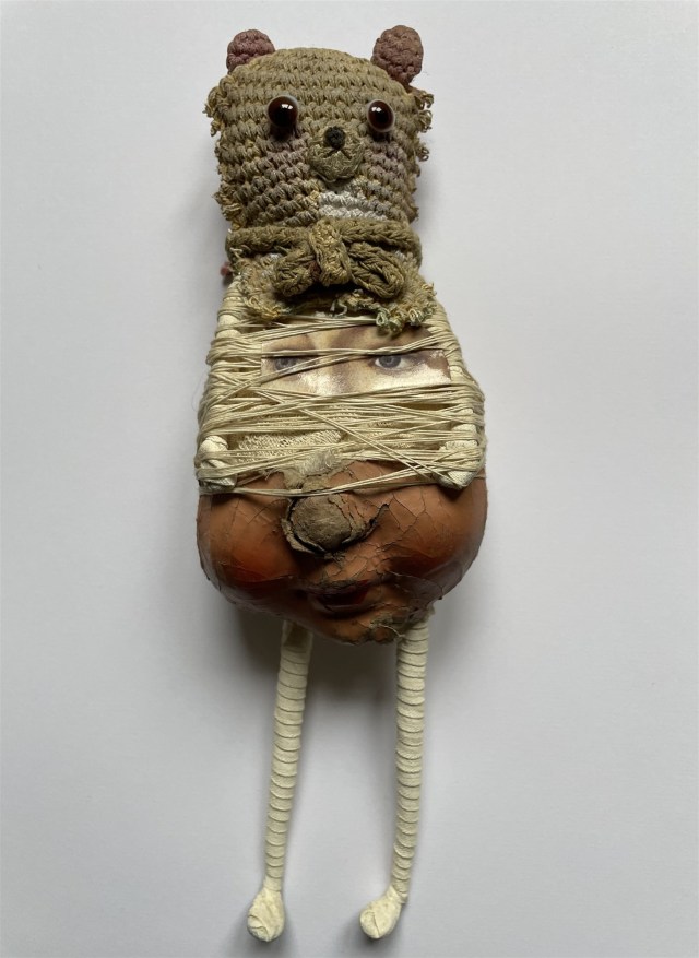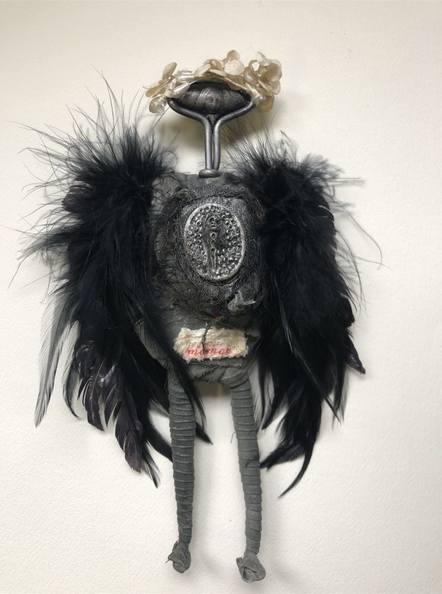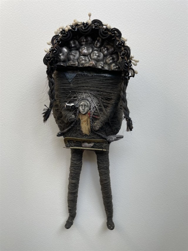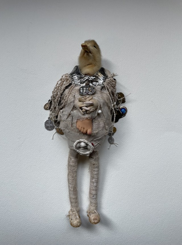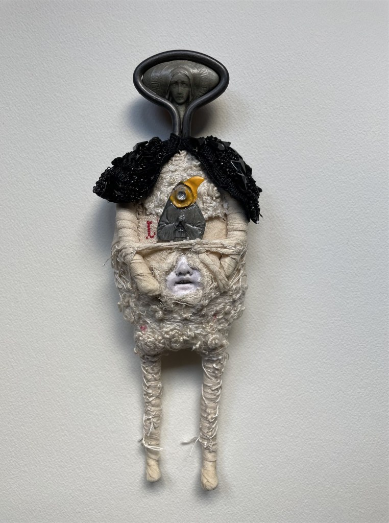 POUPÉE N°666. Tissus – Tête de caneton – Aiguille – Céramique – Médailles – Rouage de montre – Fer. 22 cm x 8 cm.