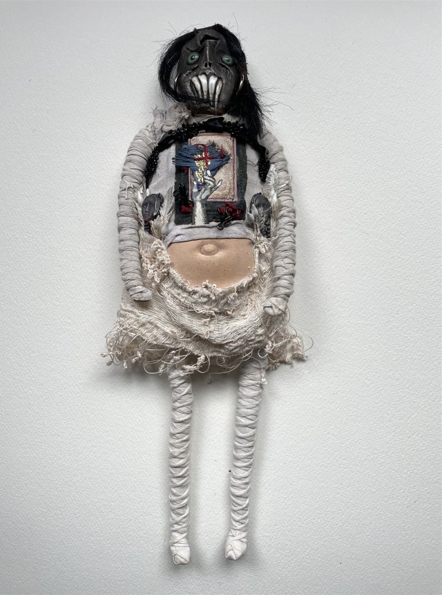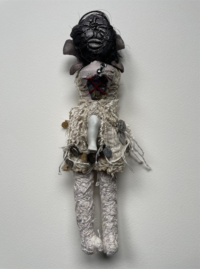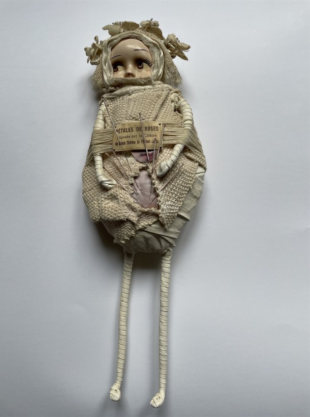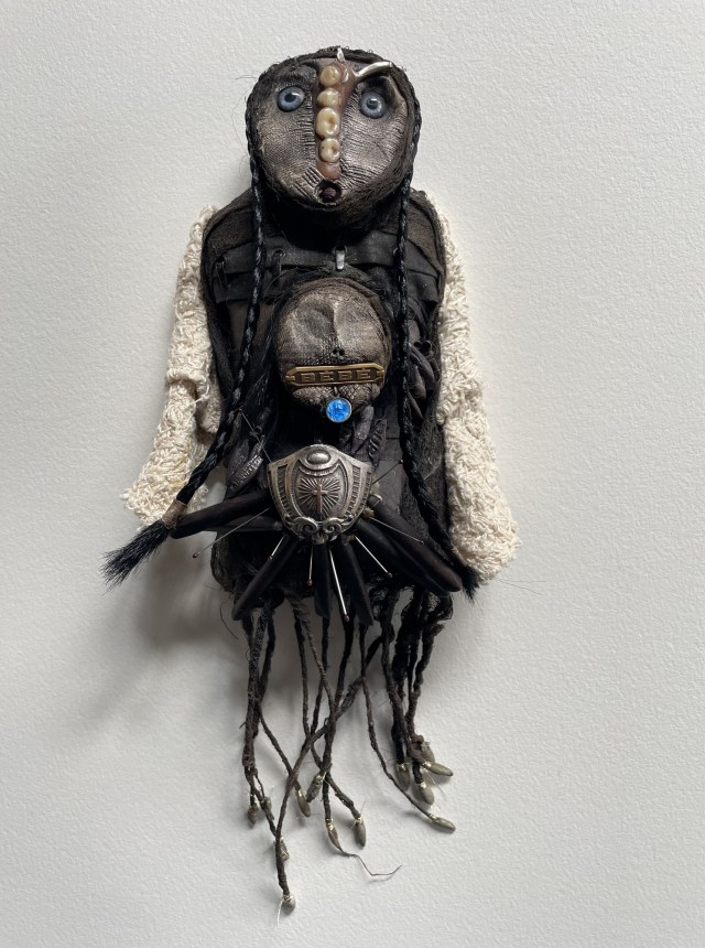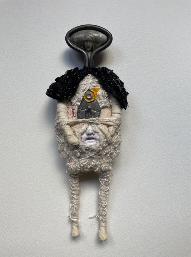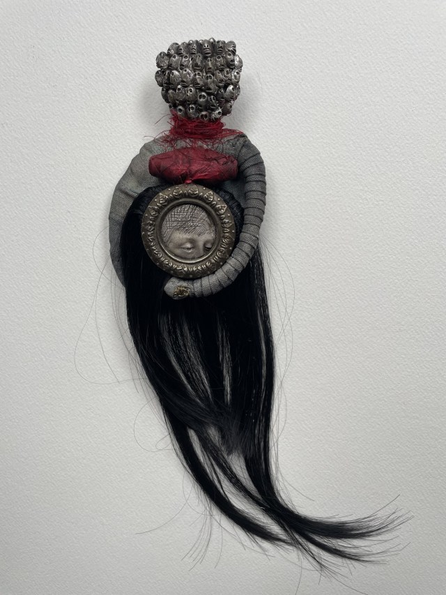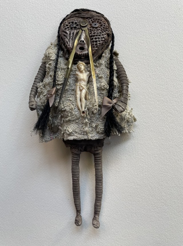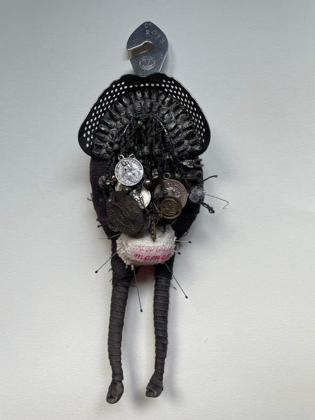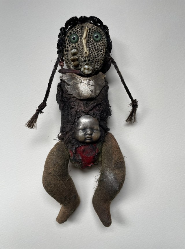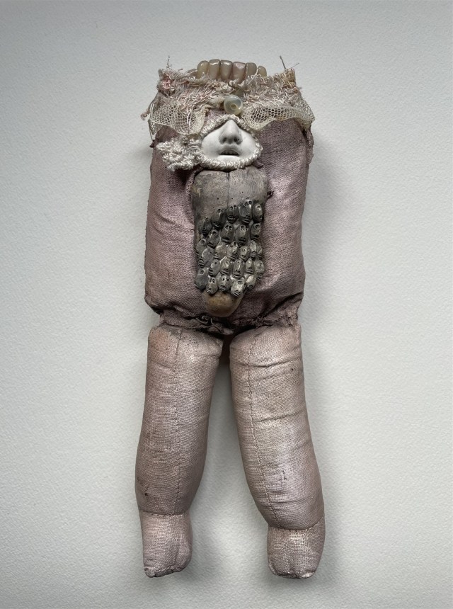 POUPÉE N°648 – Tissus – Céramique – Aiguille – Médailles – Broderie – Coquillage – Vertèbre – Cheveux. 24 cm x 6 cm.
