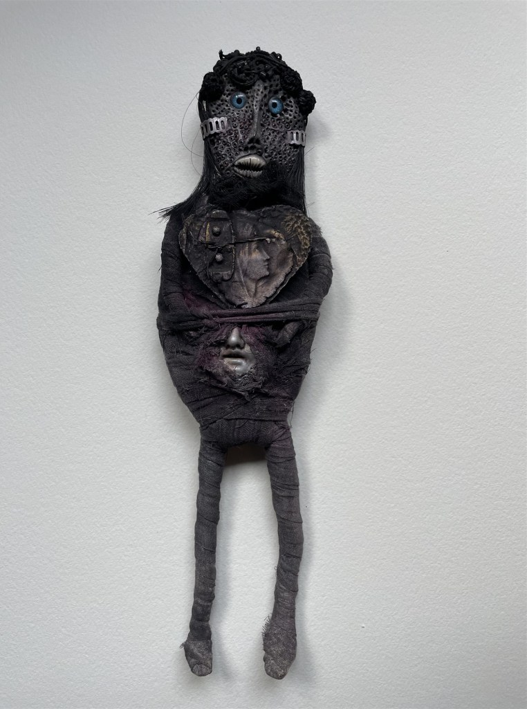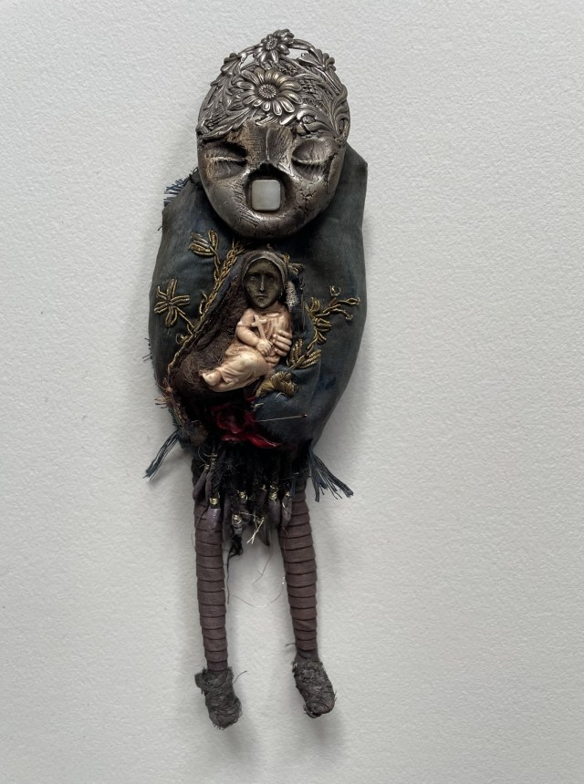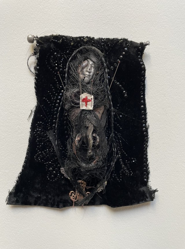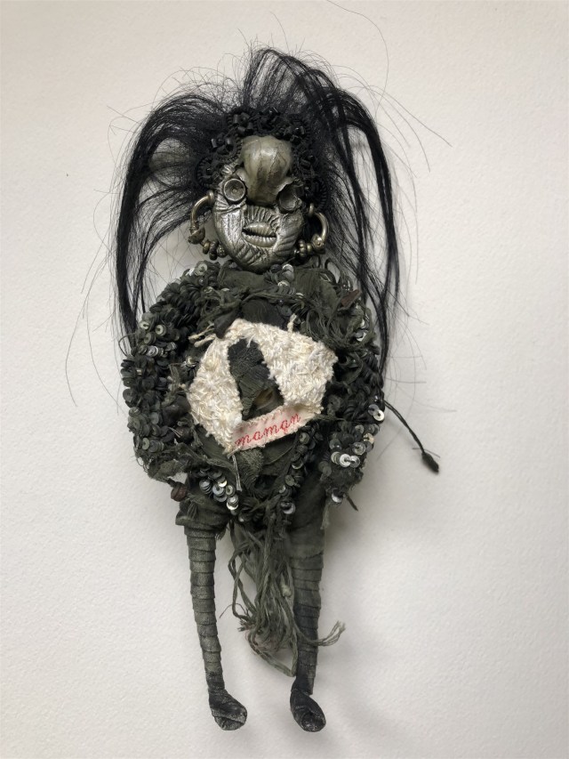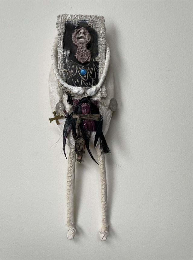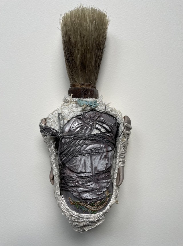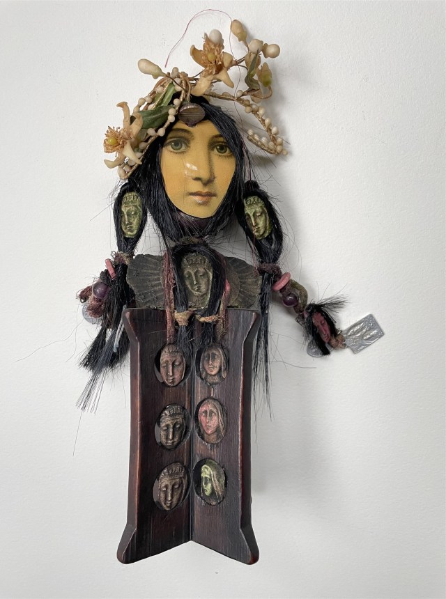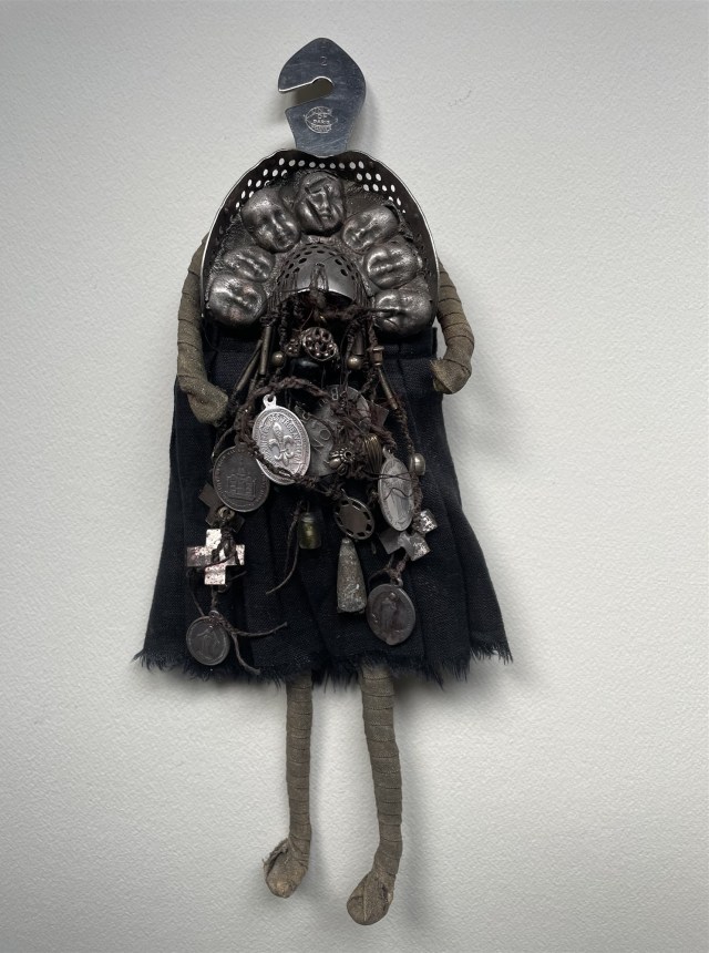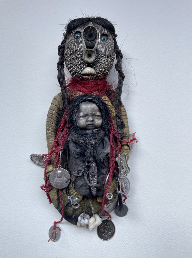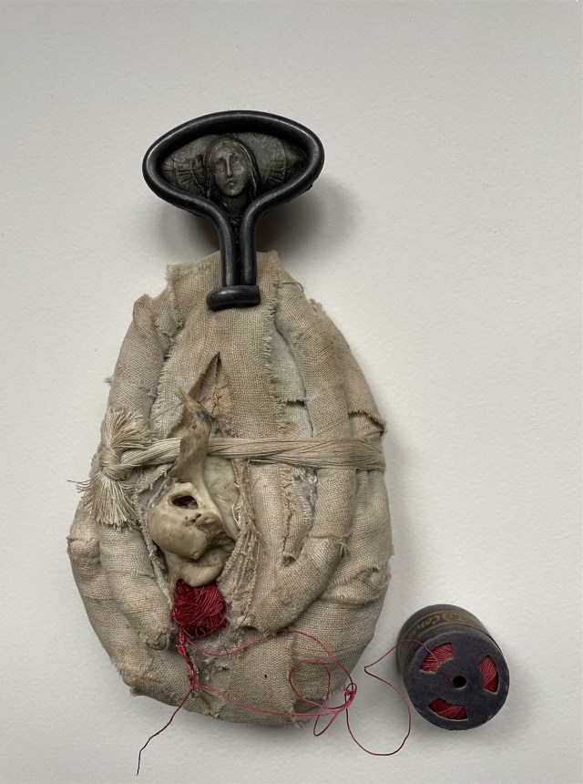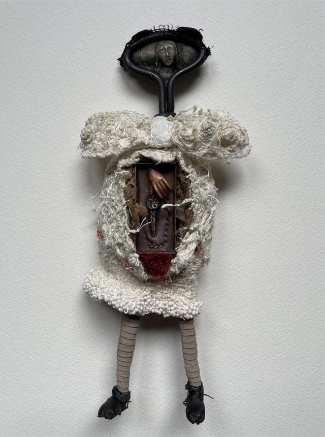 POUPÉE N°648 – Tissus – Céramique – Aiguille – Médailles – Broderie – Coquillage – Vertèbre – Cheveux. 24 cm x 6 cm.