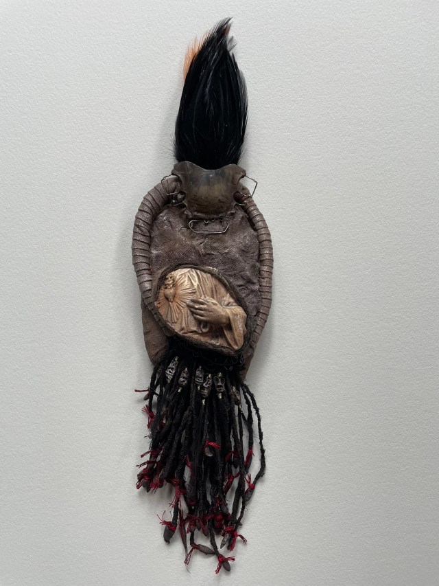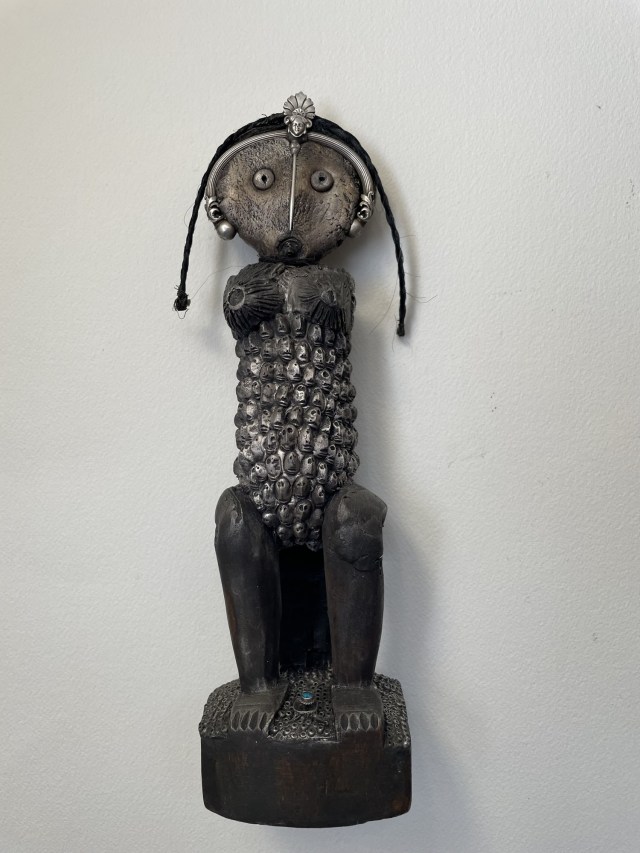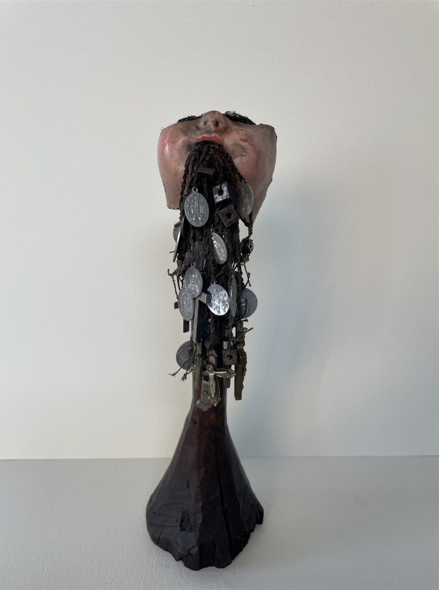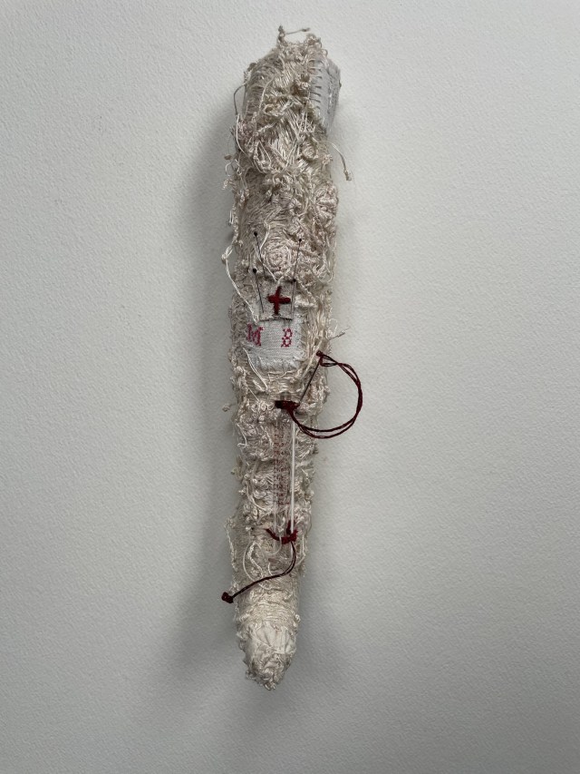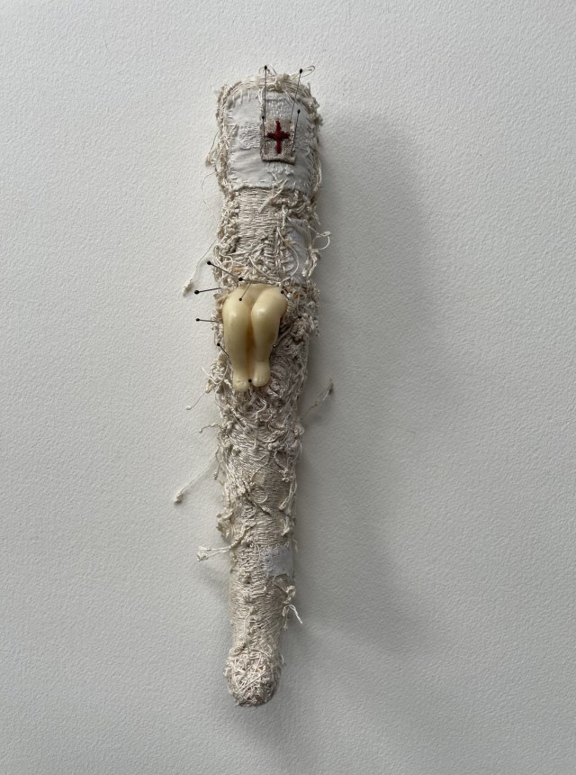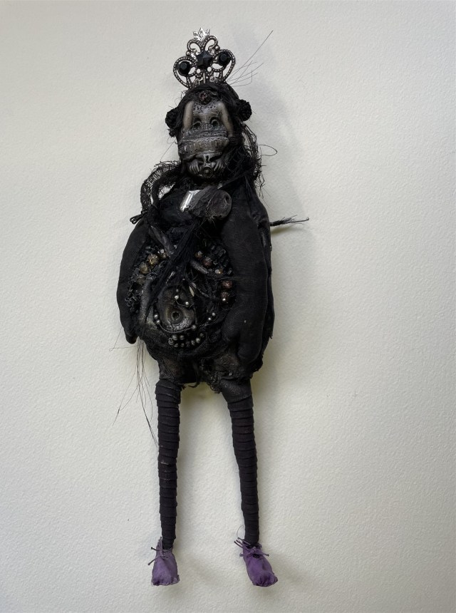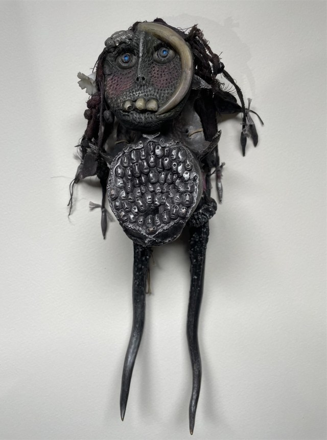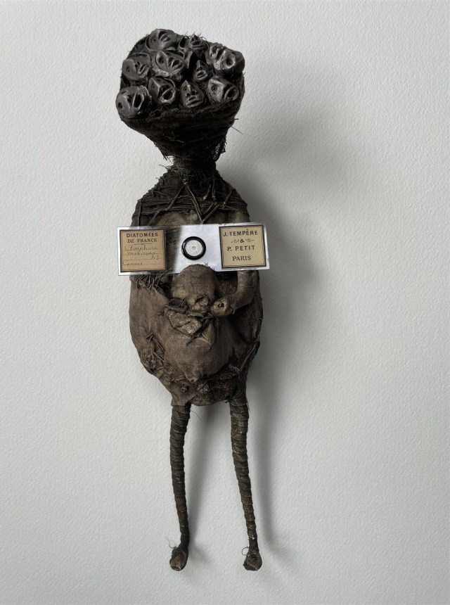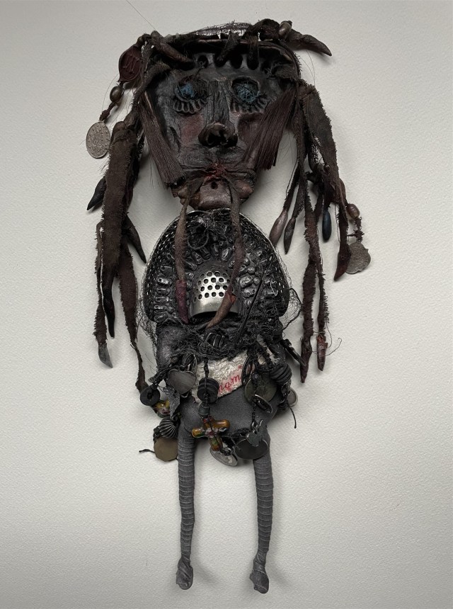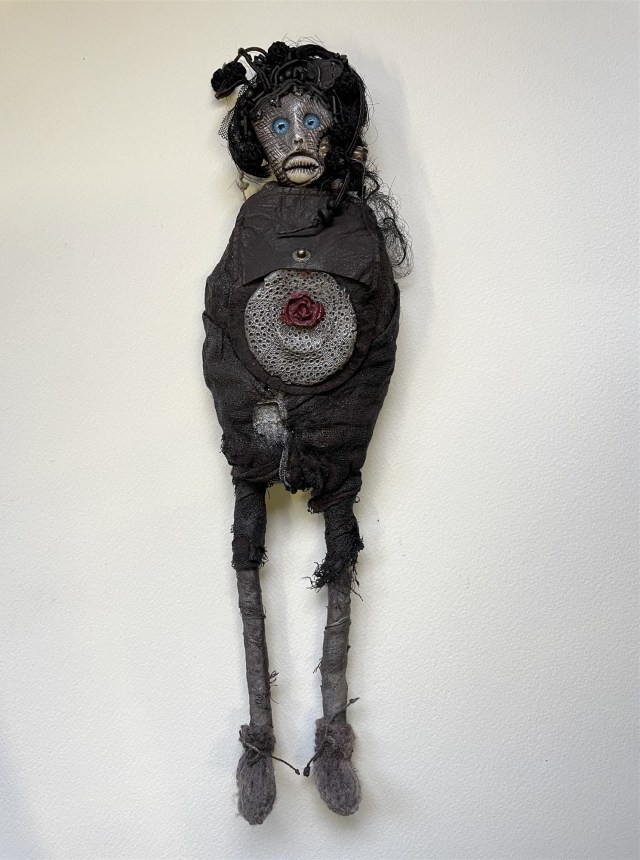 POUPÉE N°648 – Tissus – Céramique – Aiguille – Médailles – Broderie – Coquillage – Vertèbre – Cheveux. 24 cm x 6 cm.