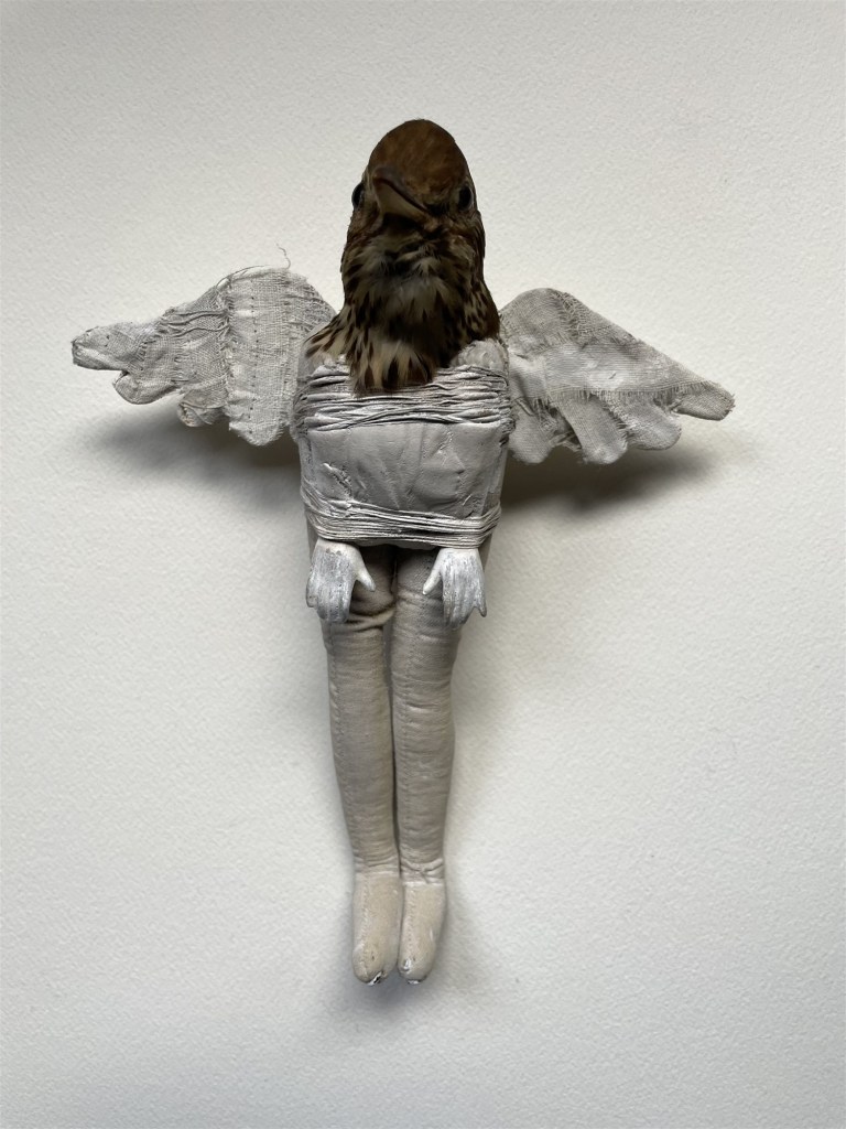 POUPÉE N°608 – Tissus – Céramique – Tête d’oiseaux. 18 cm x 21 cm.