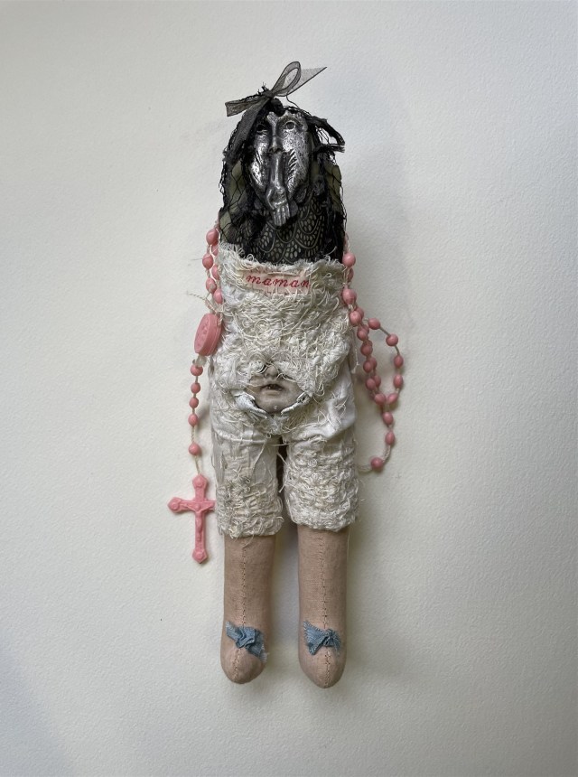 POUPÉE N°606 -Tissus – Céramique – Chapelet rose – Fer – Broderie maman. 25 cm x 6 cm.