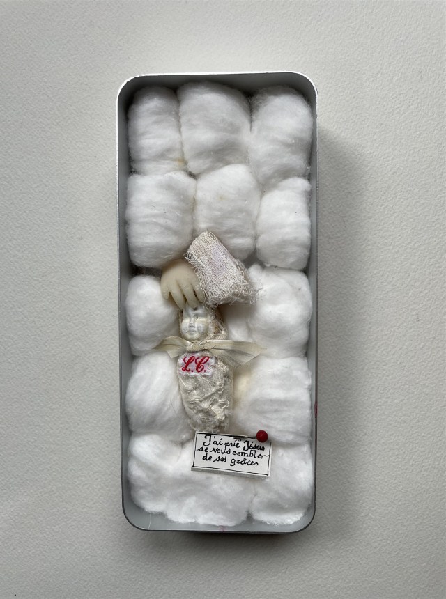 POUPÉE N°609 – Boîte infirmière – Coton – Main en cire – Céramique. 17 cm x 7 cm.