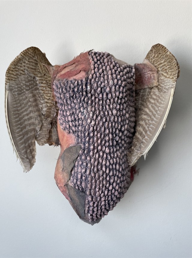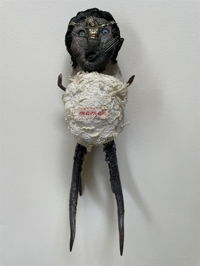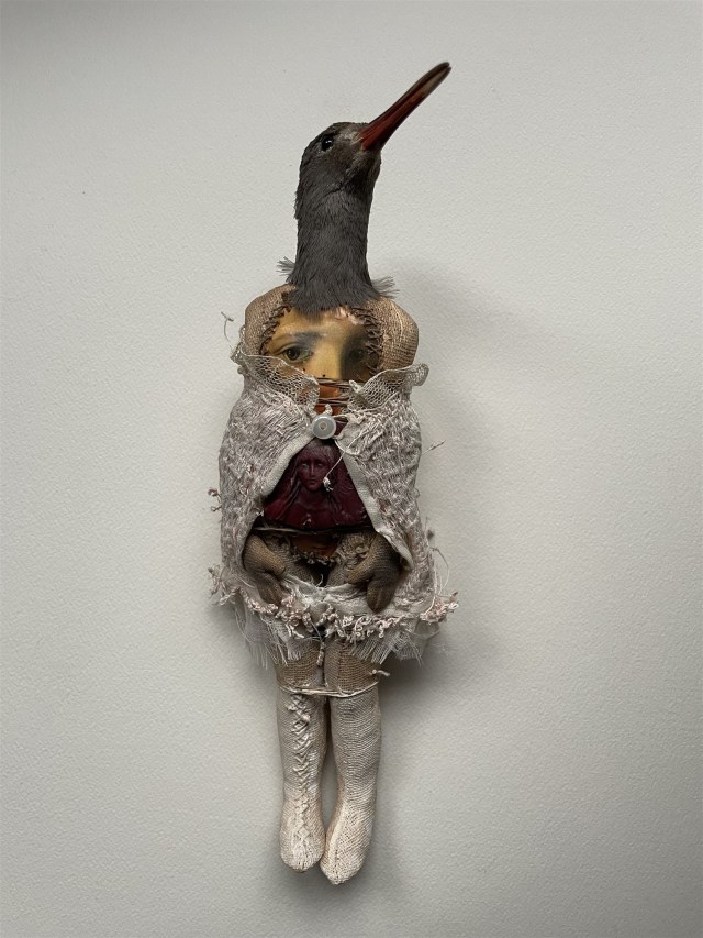 POUPÉE N°614 – Tissus – Céramique – Broderie – Tête d’oiseaux. 21 cm x 14 cm.