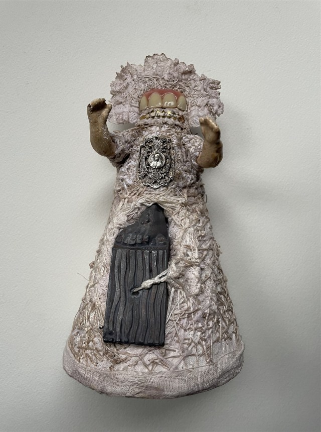POUPÉE N°633 – Tissus – Céramique – Dent – Perles – Broderie – Boucles d’oreilles. 32 cm x 10 cm.
