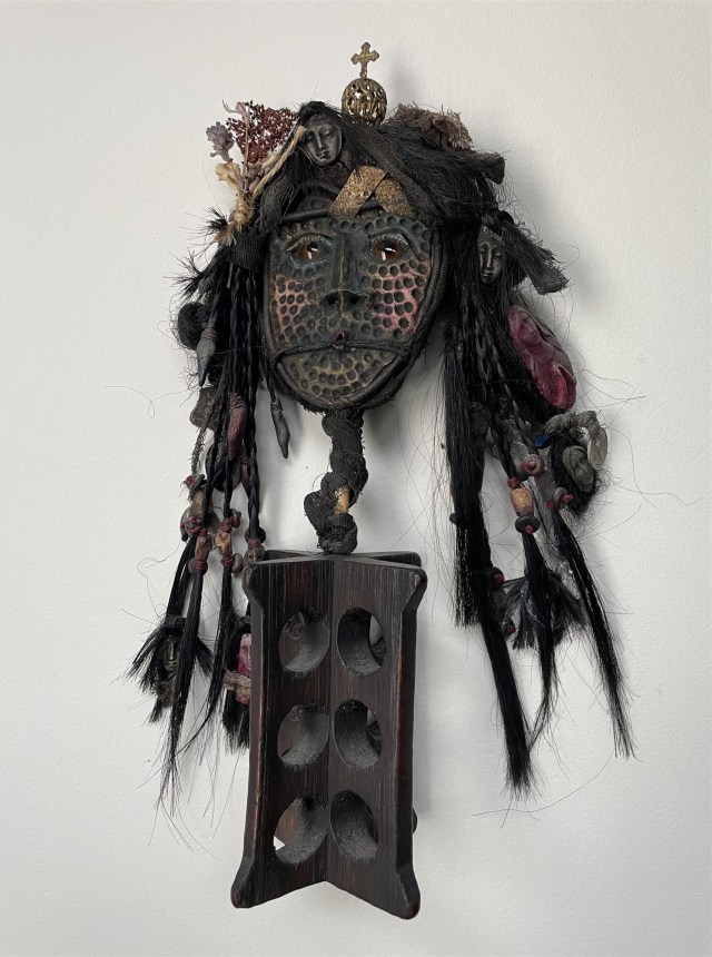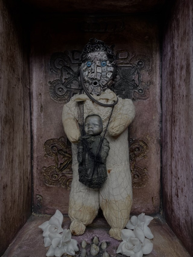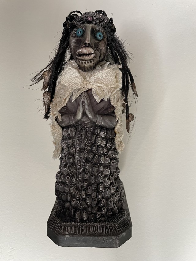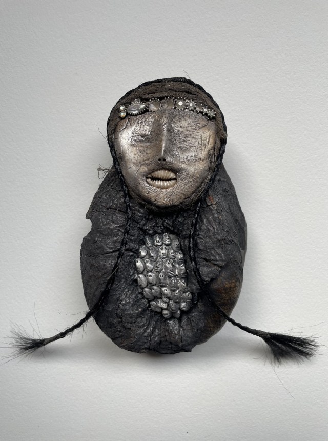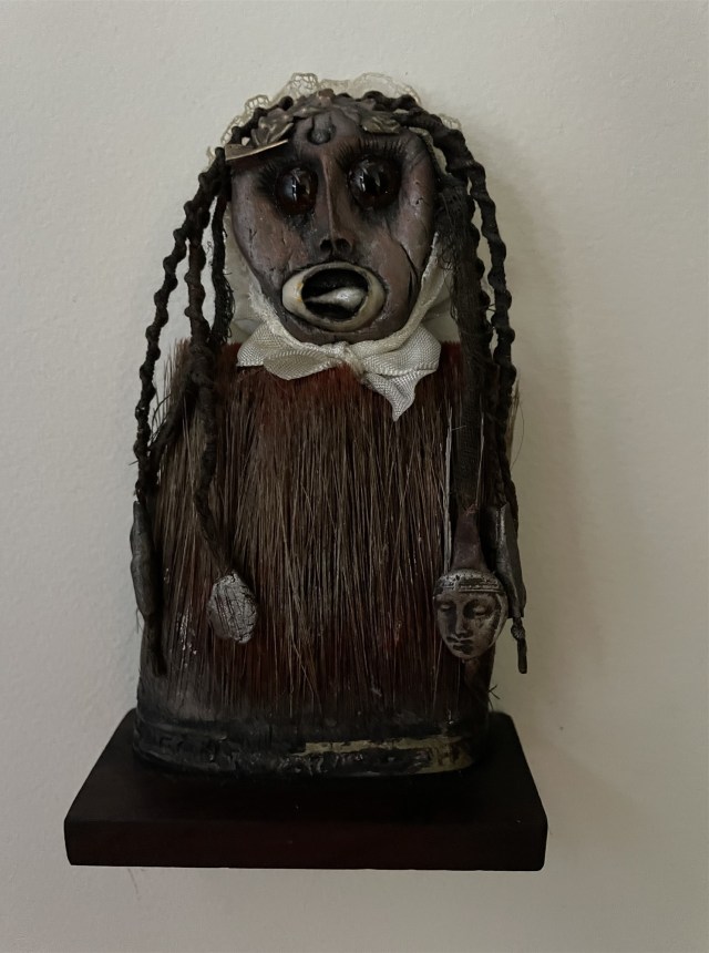 POUPÉE N°602 – Tissus – Céramique – Cheveux – Perles – Coquillage – Crâne. 24 cm x 8 cm.