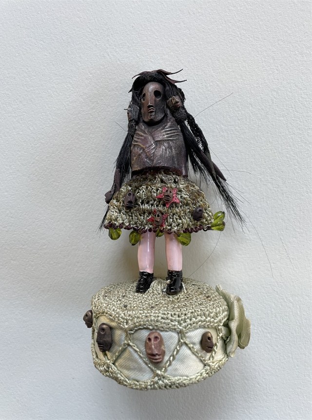 POUPÉE N°616 – Tissus – crochet – Céramique – Perles – Socle : 15 cm x 5 cm. Socle 7 cm x 2 cm.
