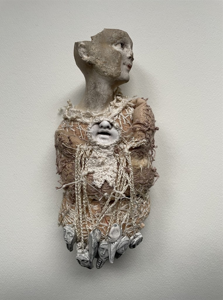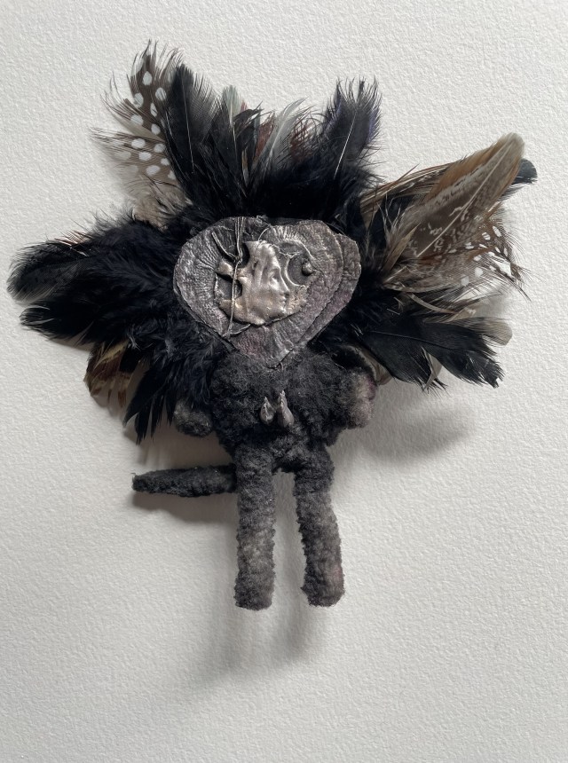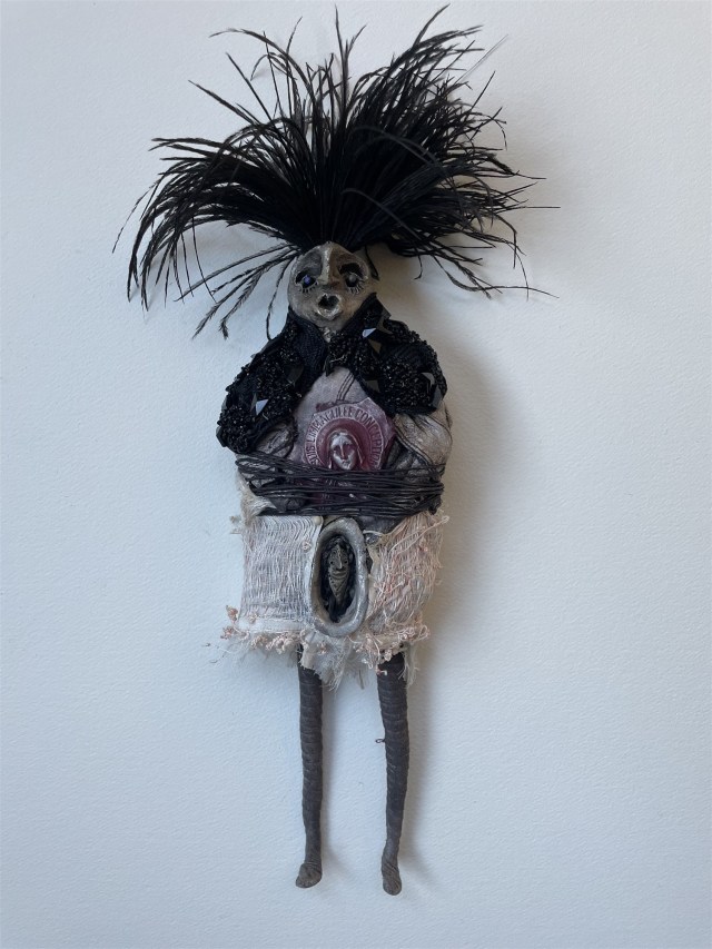 POUPÉE N°623 – Tissus – Céramique – Plumes – Perles – Broderie. 30 cm x 9 cm.