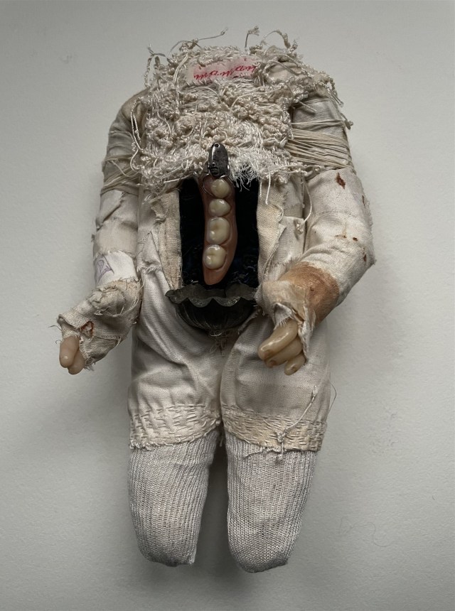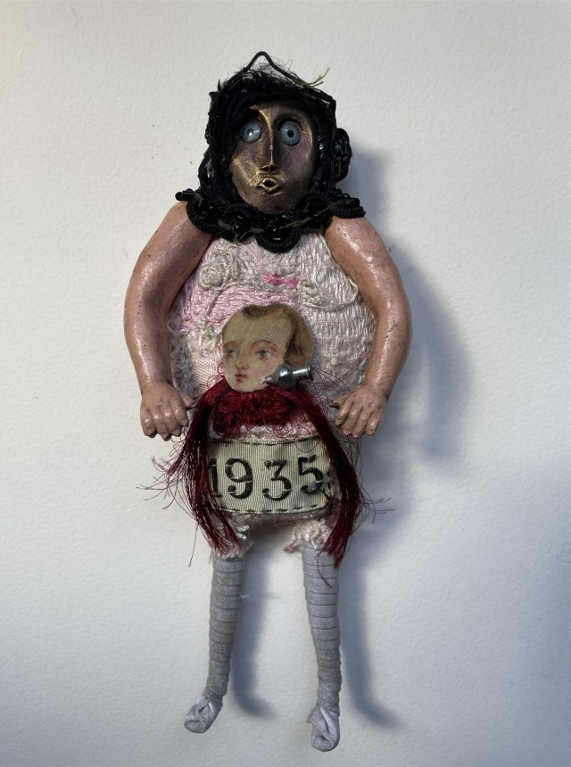 POUPÉE N°665. Tissus – Céramique – Mâchoire – Aiguille – Cheveux – Médailles – Broderie. 15 cm X 5 cm.