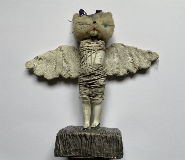 POUPÉE N°626 – Poupée réalisé pour Enzo notre deuxième perles de lune… Tête petit chat – Céramique – Ailes d’ange – Ficelle. 16 cm x 16 cm.