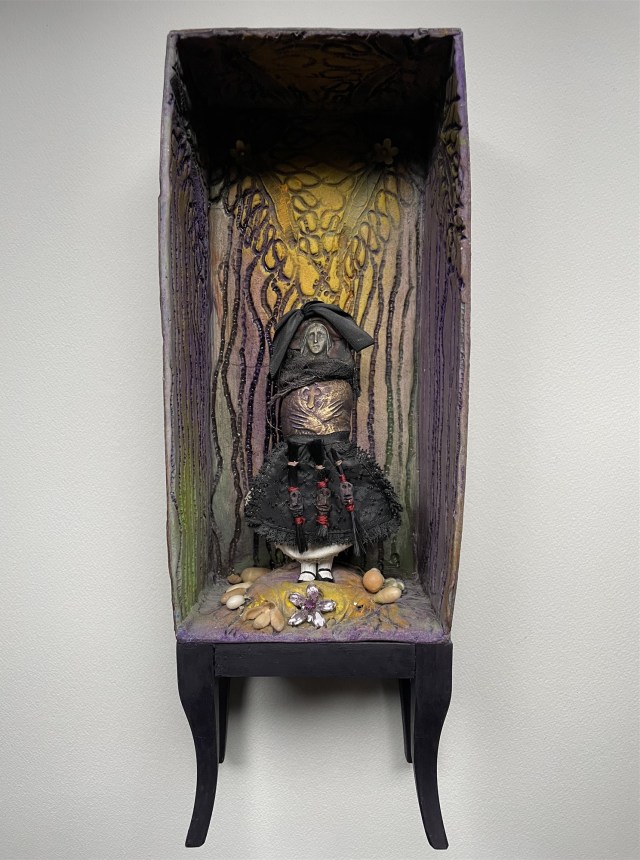 POUPÉE N°628 – Boîte sur piètement – Tissus – Céramique – Perles. 34 cm x 12 cm.