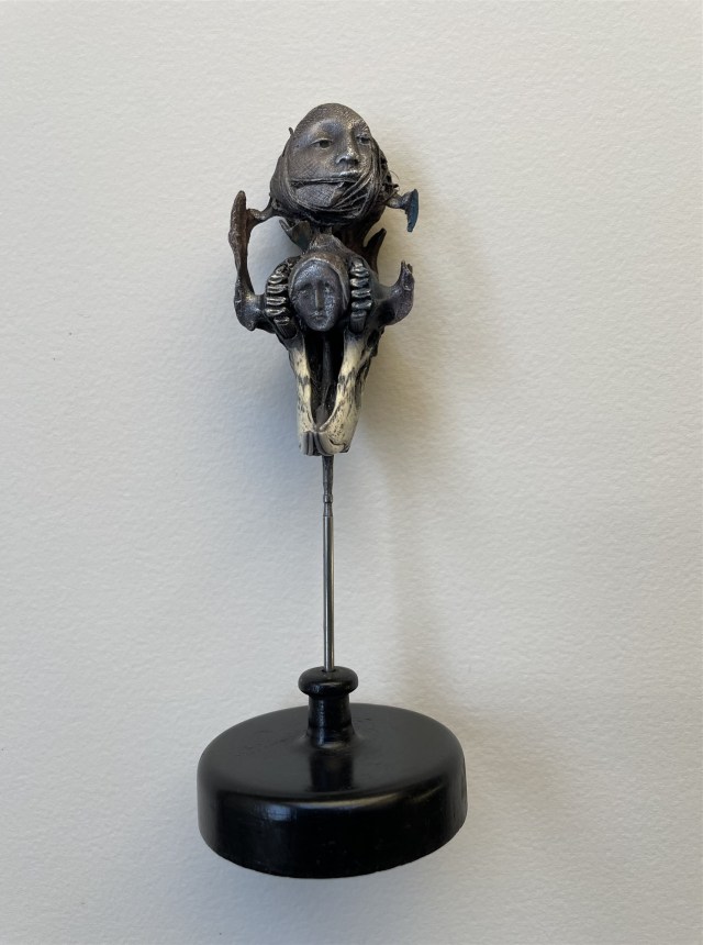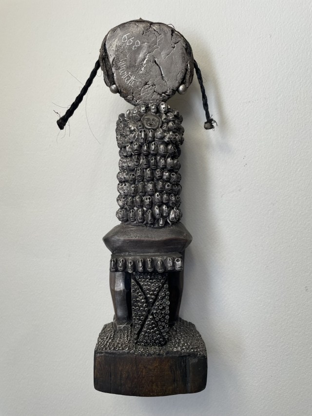 POUPÉE N°668. Tissus – Céramique – Ficelle – Bogue d’arbre – Os pour socle. Dimension poupée : 14,5 x 3 cm. Socle : 8 cm x 7 cm.