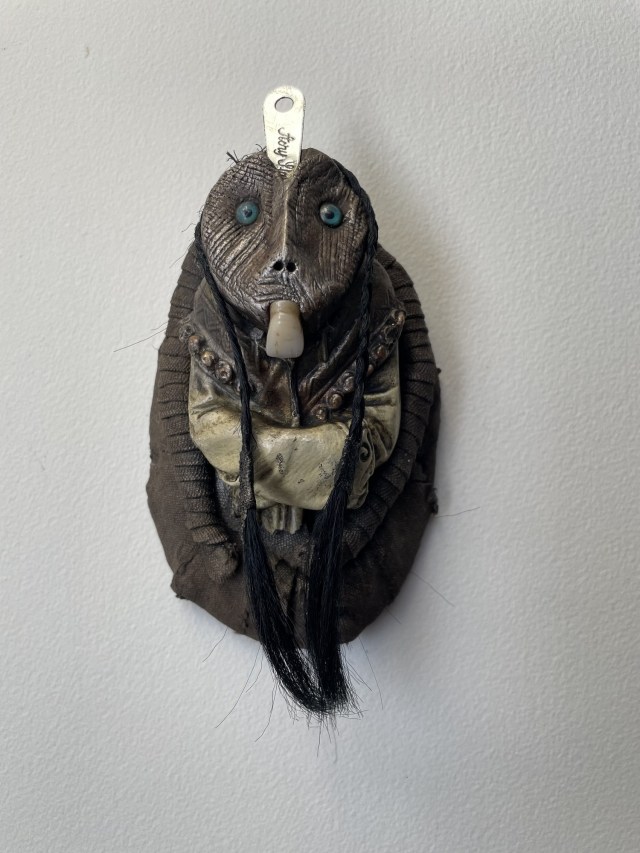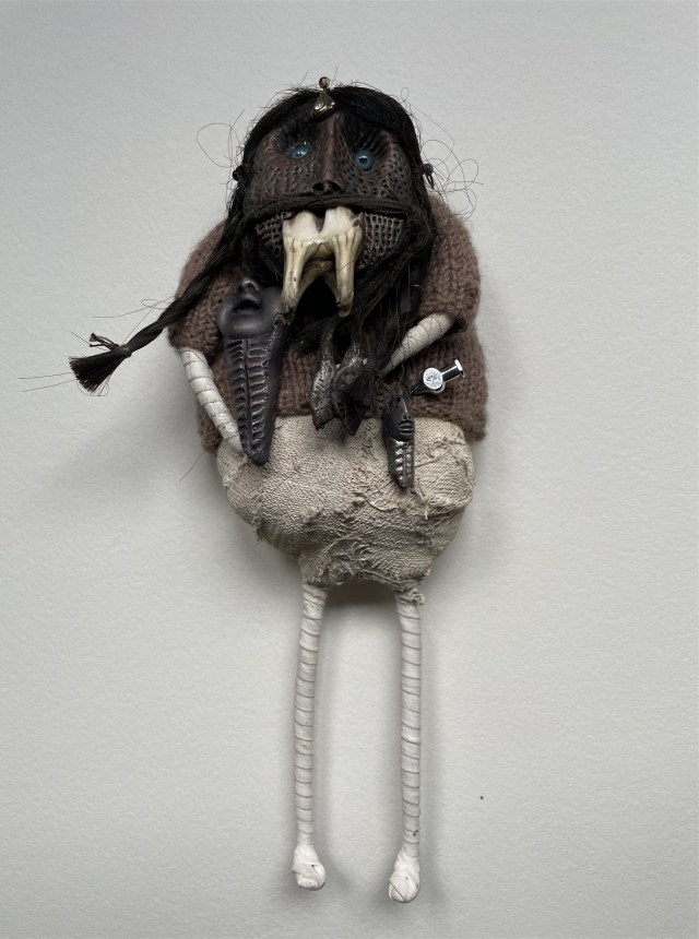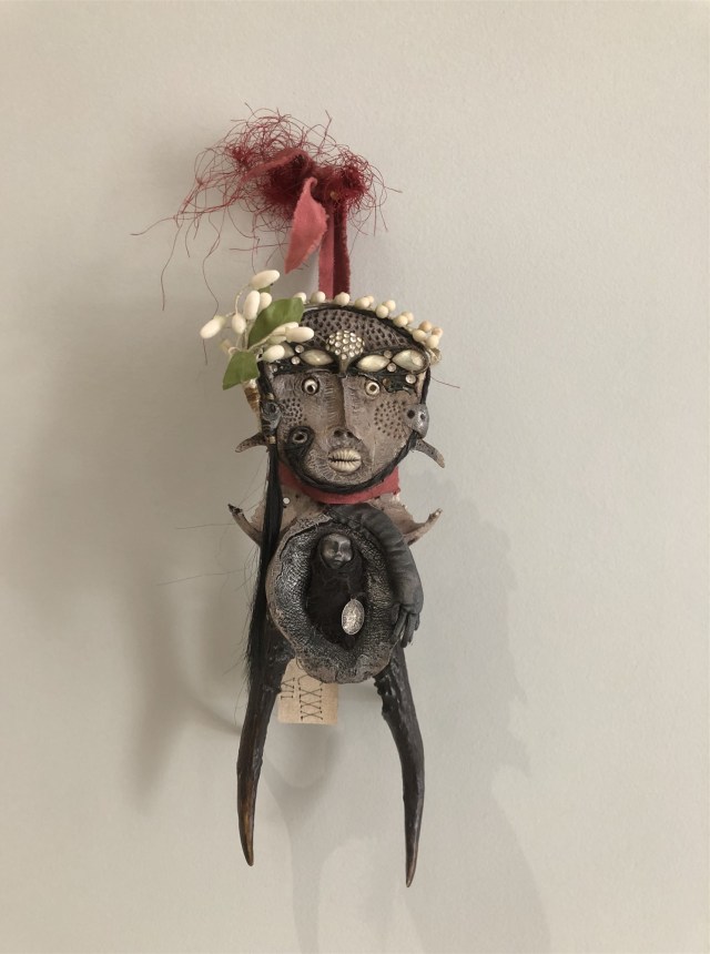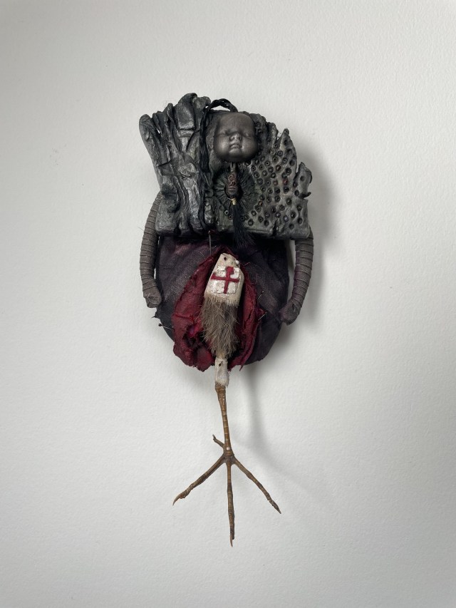 POUPÉE N°683. Tissus – Céramique – Cheveux – Dent – Fer – Patte d’oiseau – Fils de soie rouge. 19 cm x 7 cm.
