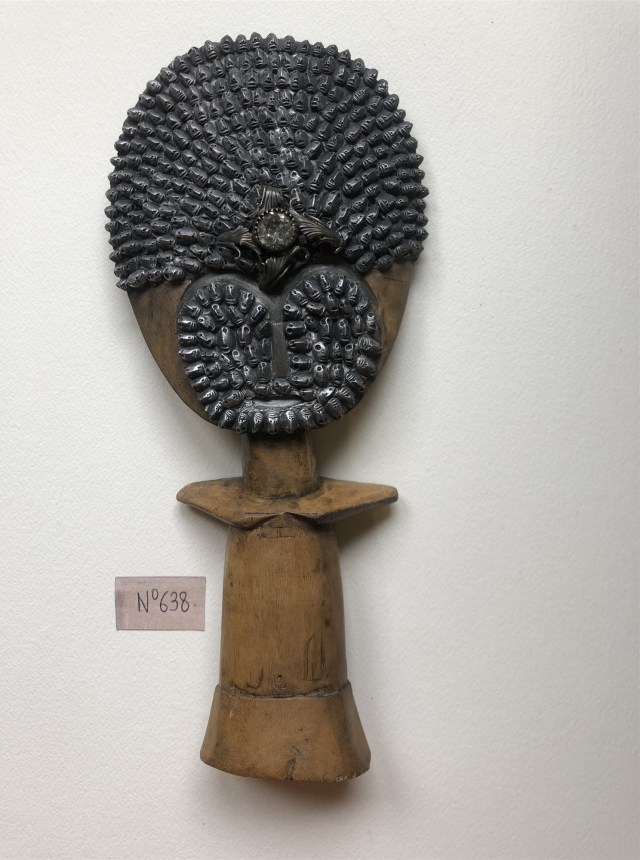 POUPÉE N°678. Recto. Bois – Perles – Céramique – Cheveux – Broche. 23 cm x 7 cm.