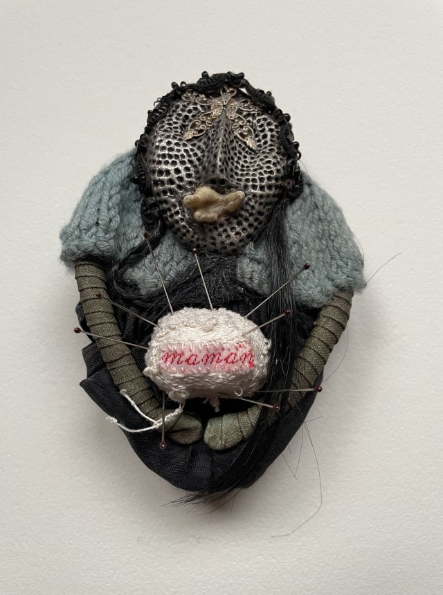 POUPÉE N°691. Tissus brodé – Céramique – Aiguilles – Broche – Fils d’or. 24 cm x 8 cm.