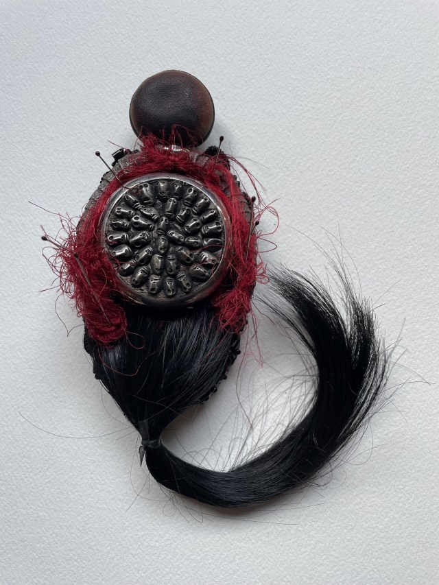 POUPÉE N°664. Tissus – Céramique – Aiguille – Cheveux – Dents – Fil de soie rouge – Perles. 17 cm x 7 cm.