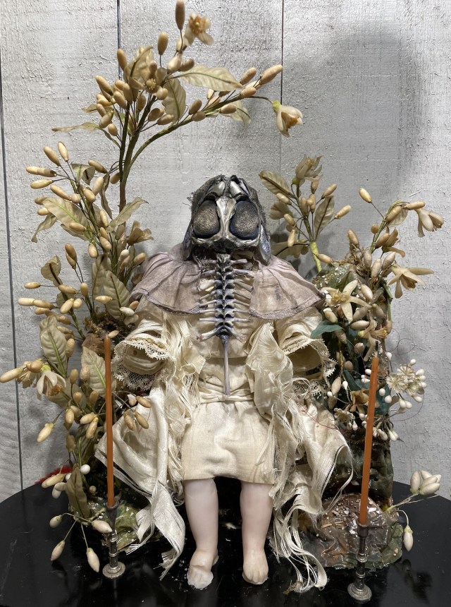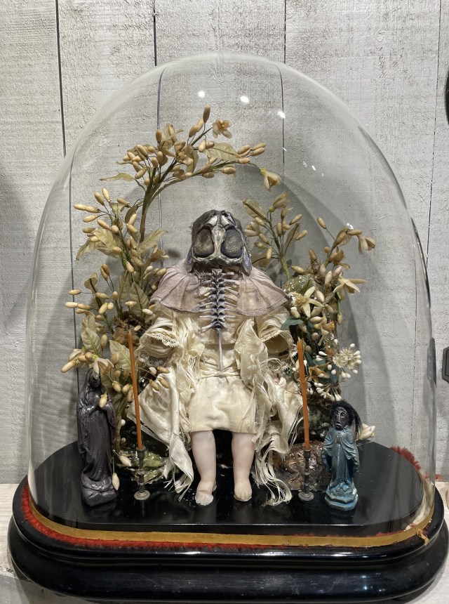 POUPÉE N°692 (Avec le globe). Tissus – Poupée ancienne en cire – Squelette de crapaud – Taureau – Petits bougeoirs – Soie – Sous globe. 42 cm x 45 cm.
