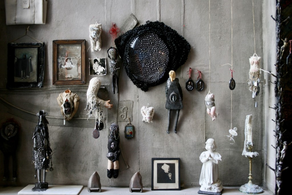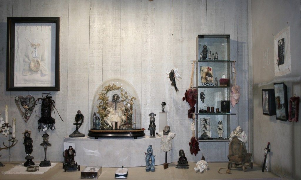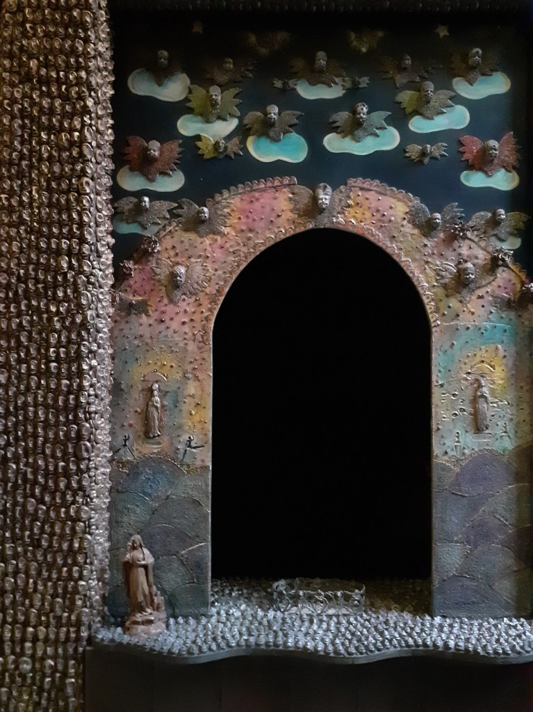 La Maison, c’est un « petit musée consacré aux œuvres de Mariette, artiste dans la mouvance de “l’art singulier” œuvrant dans le domaine des reliquaires, icônes, ex-voto, sur des mises en scène de notre quotidien. » C’est un bunker énorme en haut d’une colline. Un sanctuaire halluciné et hallucinant. C’est quelque part en Isère, entre la plaine du Guiers et le massif de la Chartreuse. Au loin on aperçoit les montagnes. C’est un univers à soi, un monde à part entière, insoupçonnable derrière les hauts murs de sa forteresse et la nature autour. C’est par hasard que j’y suis entrée, sans connaître et sans me douter. Au vert des arbres, au gris-béton de l’enceinte, au bleu lointain des sommets a succédé le rouge, écarlate, pourpre, sombre et presque noir du dedans. De la Maison de Mariette.