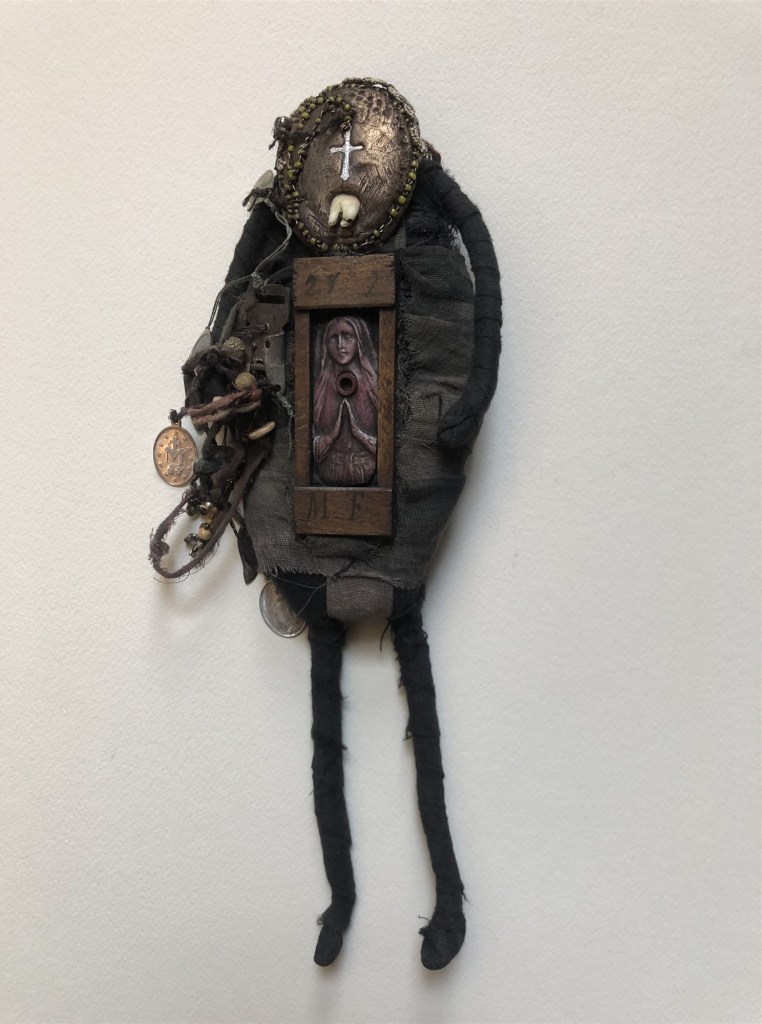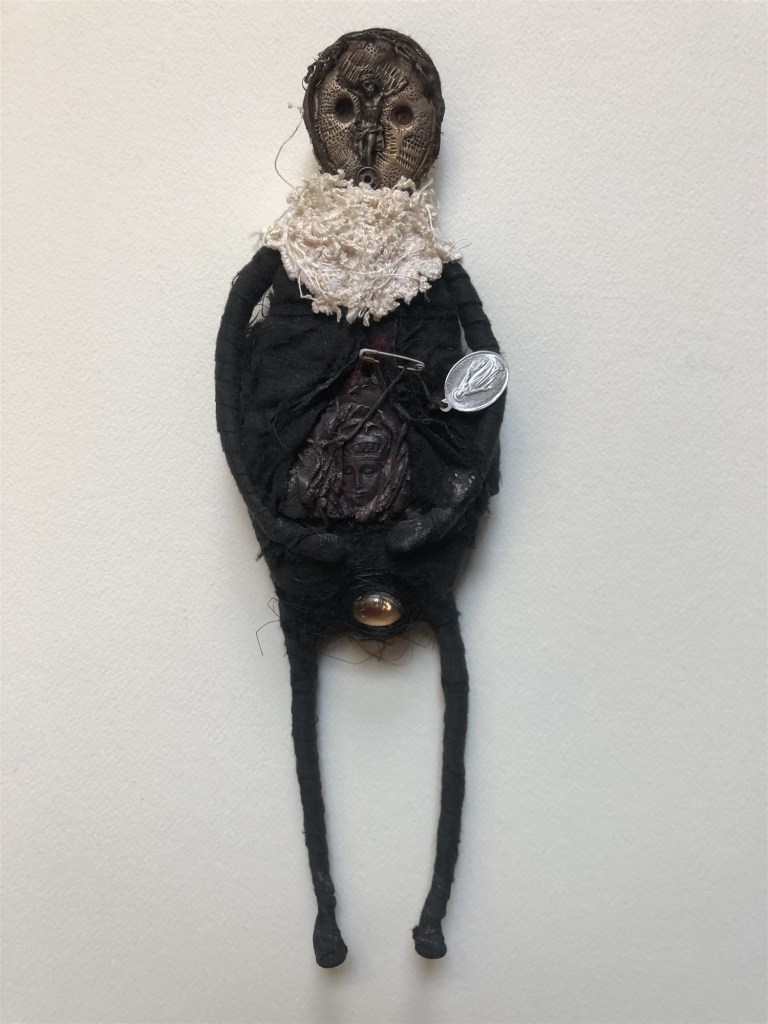 POUPÉE N°155 – Tissus – Céramique – Médailles – Aiguille – Dent – Perles. 25 cm X 7 cm.