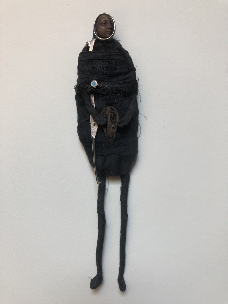 POUPÉE N°115 – Tissus – Cuir – Céramique – Aiguilles. 24 cm X 9 cm.
