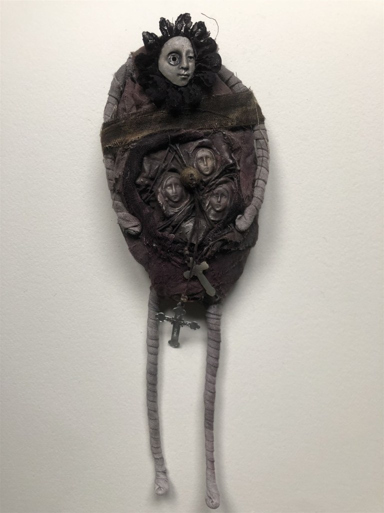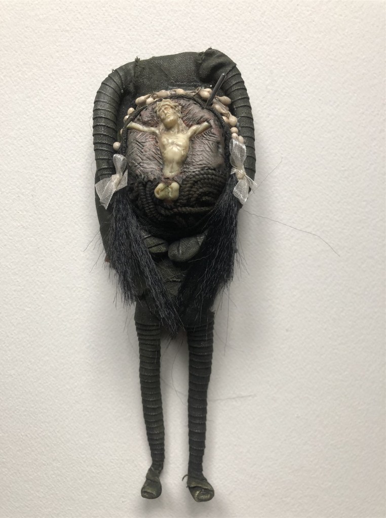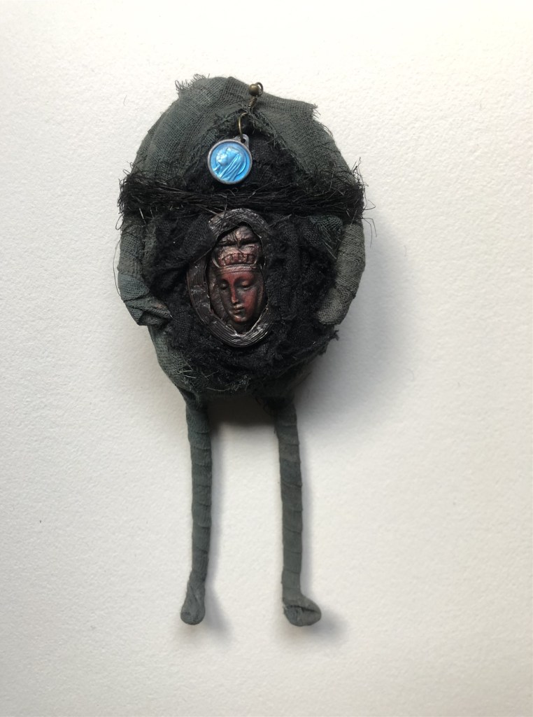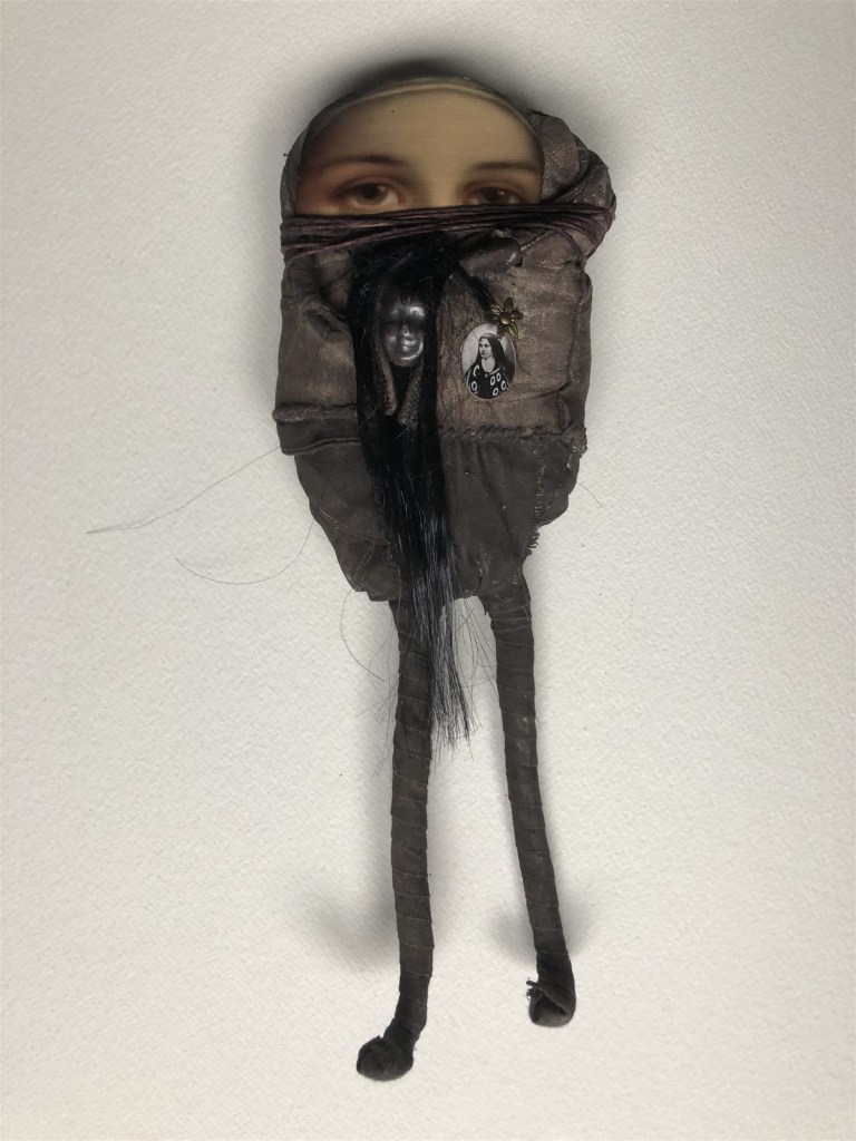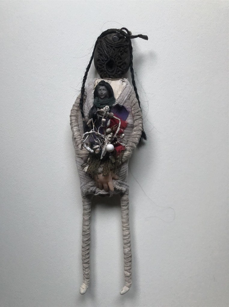 POUPÉE N°126 – Tissus – Céramique – Médaille – Aiguille – Coquillage de mon amie Christine – Cheveux. 26 cm X 9 cm.
