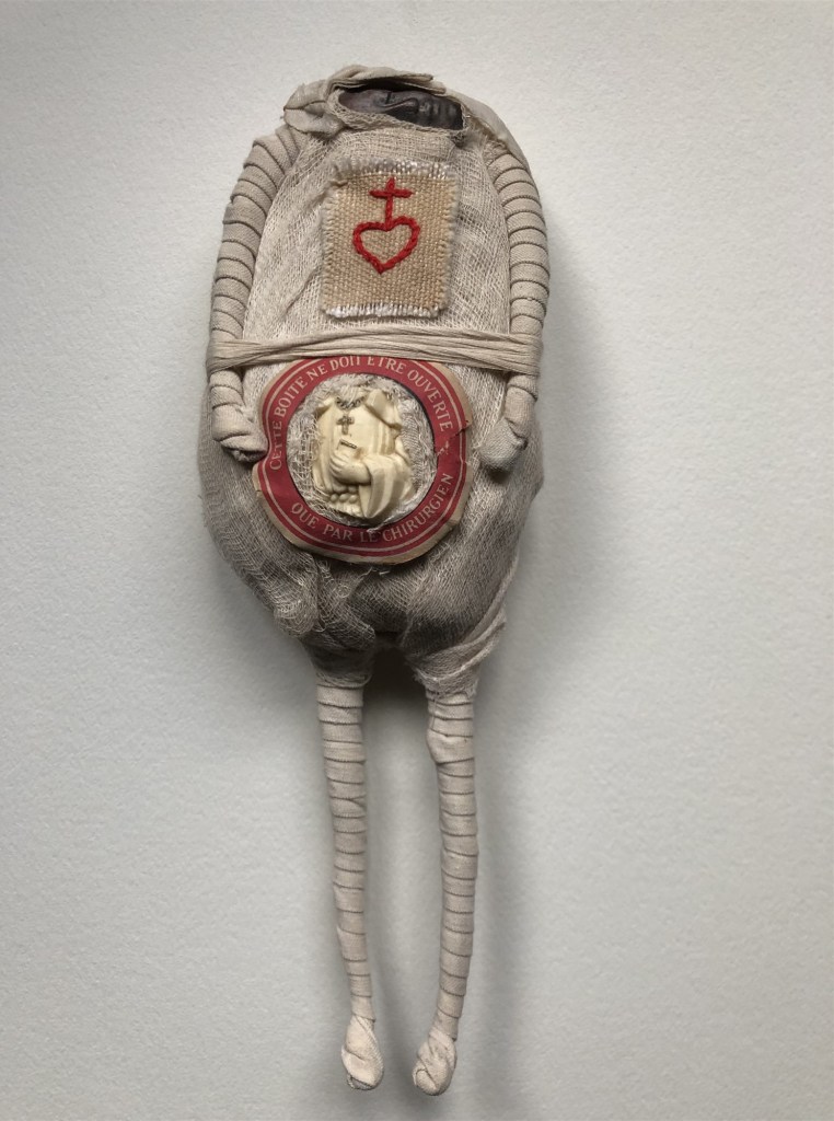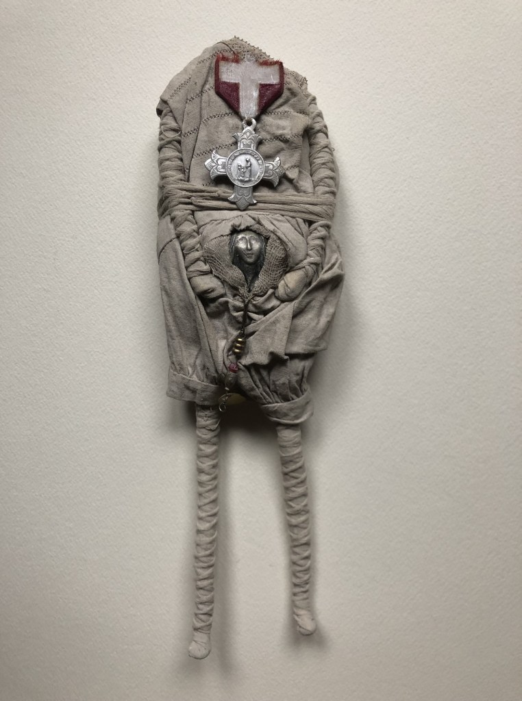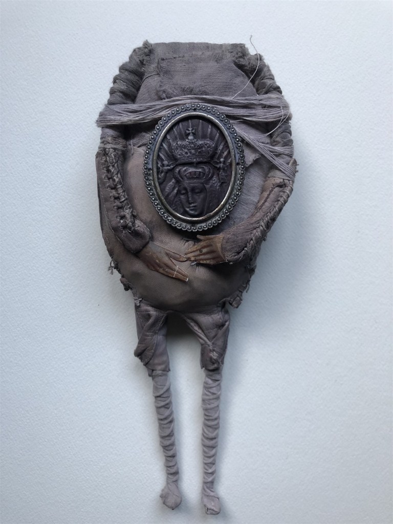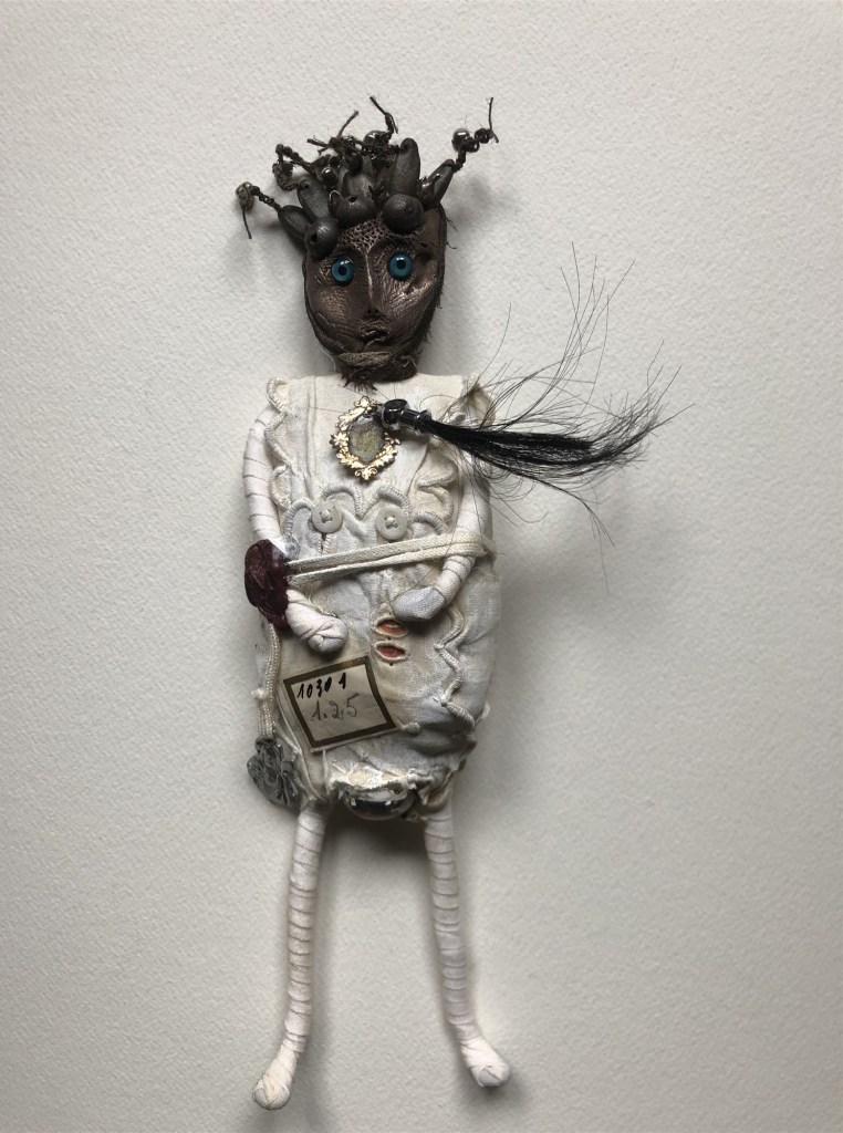POUPÉE N°164 – Tissus – Céramique – Médaille – Cuir. 25 cm X 9 cm.