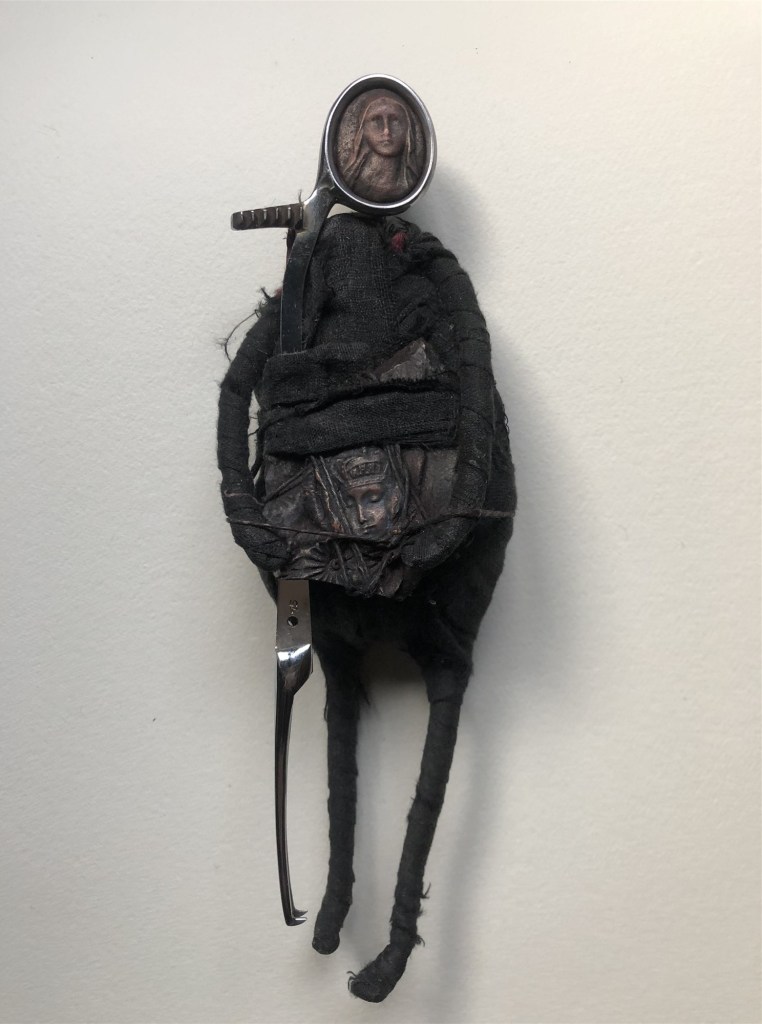 POUPÉE N°153 – Tissus – Céramique – Cheveux – Médaille – Moitié de ciseau – Cuir. 28 cm X 10 cm.