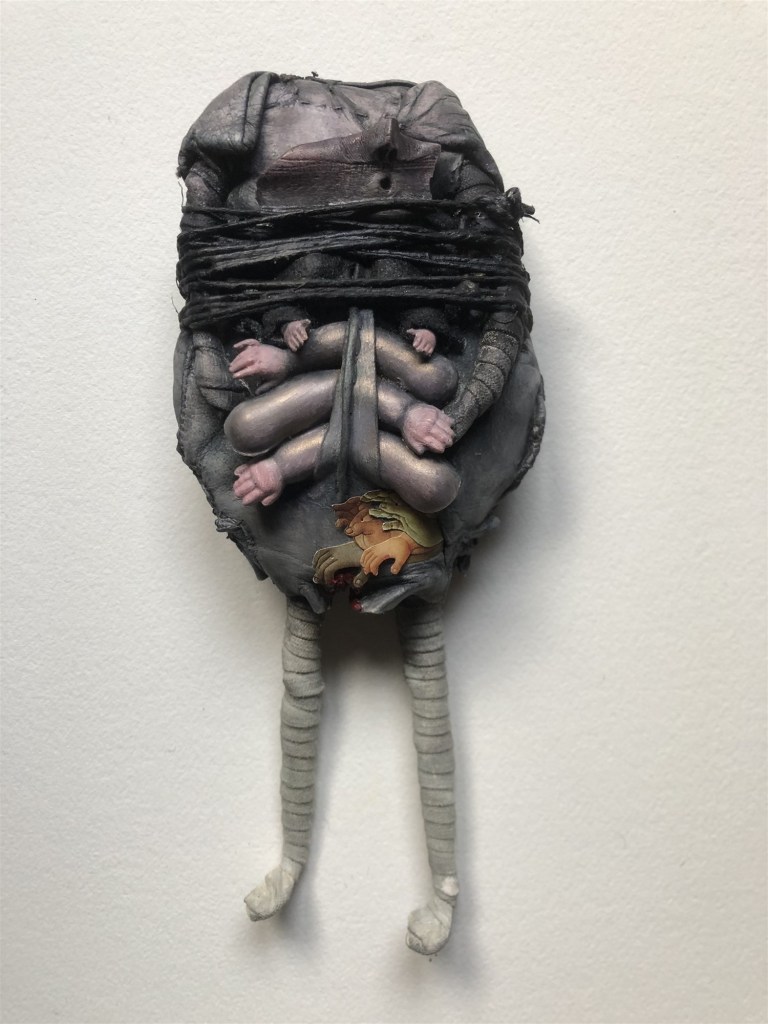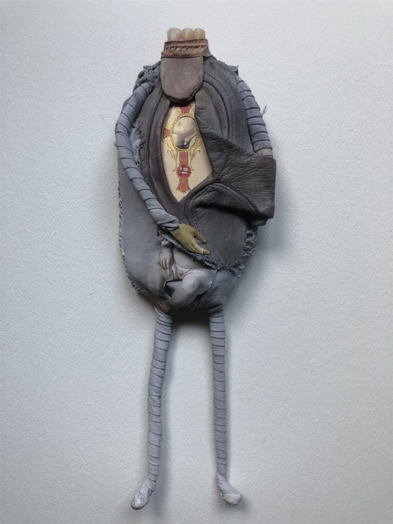 POUPÉE N°163 – Tissus – Gant cuir – Céramique – Dents. 28 cm X 10 cm.