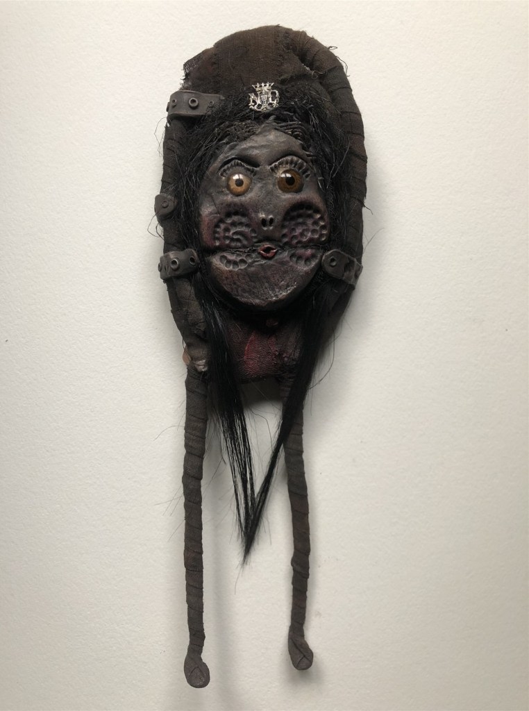 POUPÉE N°187 – Tissus – Céramique – Cheveux – Cuir. 32 cm X 12 cm.