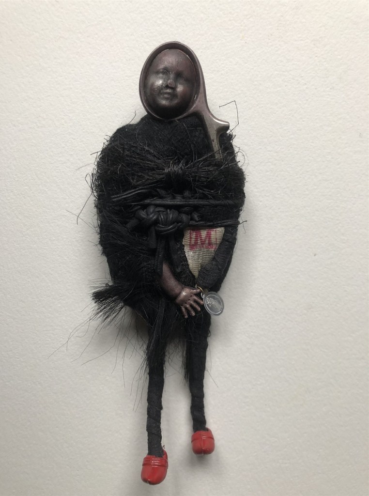 POUPÉE N°173 – Tissus – Céramique – Perles – Cuir – Médailles. 25 cm X 10 cm.