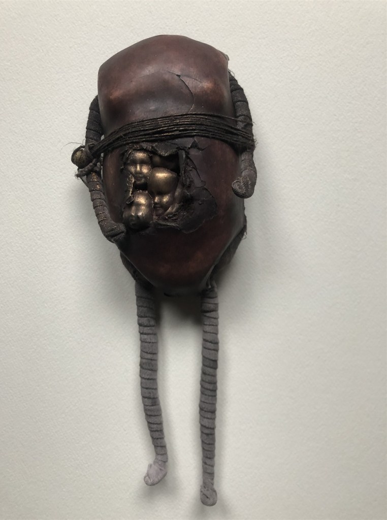 POUPÉE N°116 – Tissus – Céramique – Cuir – Perles. 22 cm X 8 cm.