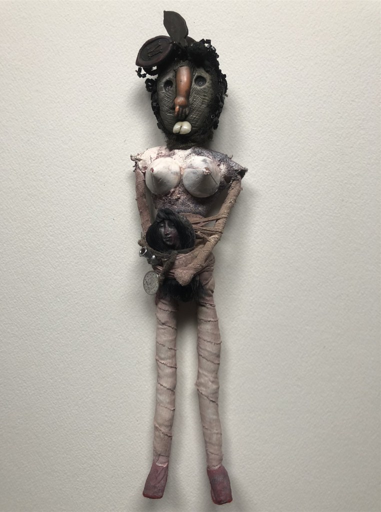 POUPÉE N°108 – Tissus – Céramique – Cheveux – Perles – Coquillage – Ergot de coq. 31 cm X 11 cm.