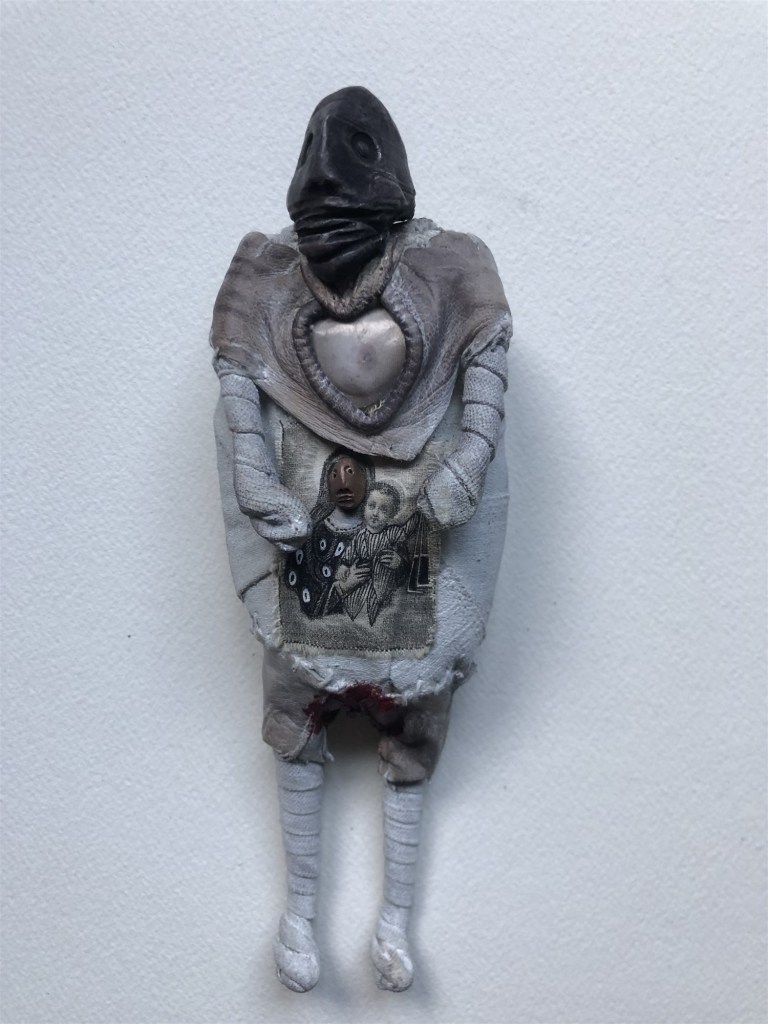 POUPÉE N°106 – tissus – Céramique – Cuir – Christ. 28 cm X 12 cm.