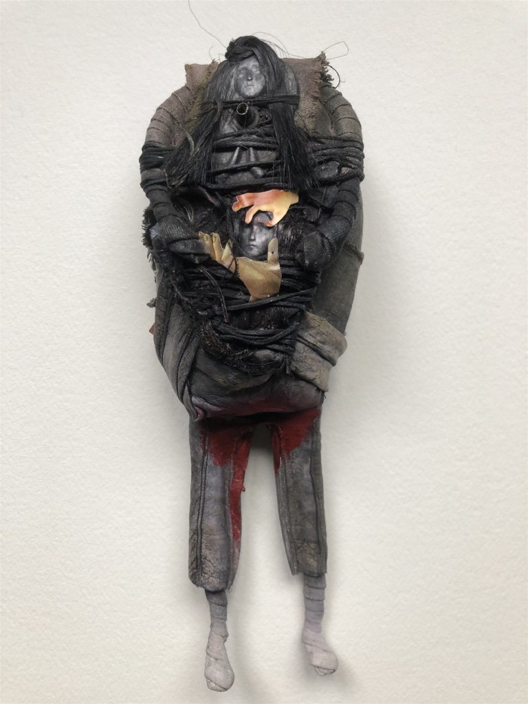 POUPÉE N°111 – Tissus – Céramique – Cheveux – Aiguilles – Ficelle. 32 cm X 12 cm.
