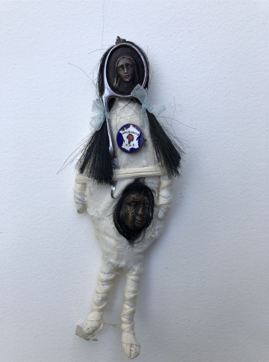 POUPEE N° 11 ← Précédent Suivant → POUPÉE N° 11 – Tissu – Cheveux – Médaille solidarité – Têtes céramique – Moitié de ciseaux – 19 cm X 7 cm