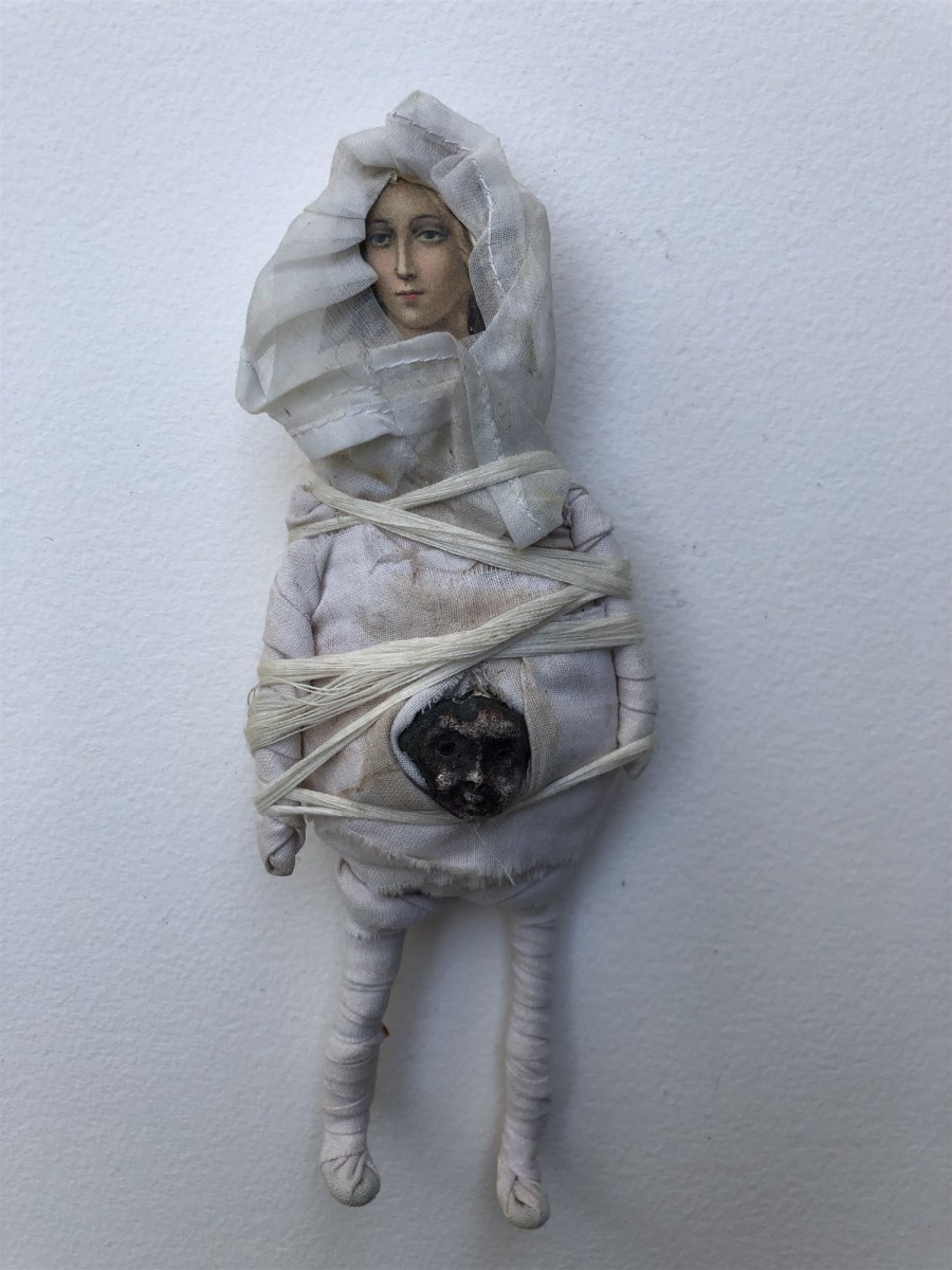 POUPÉE N° 15 – Tissus – Chromo – Tête céramique – 19 cm X 8 cm .
