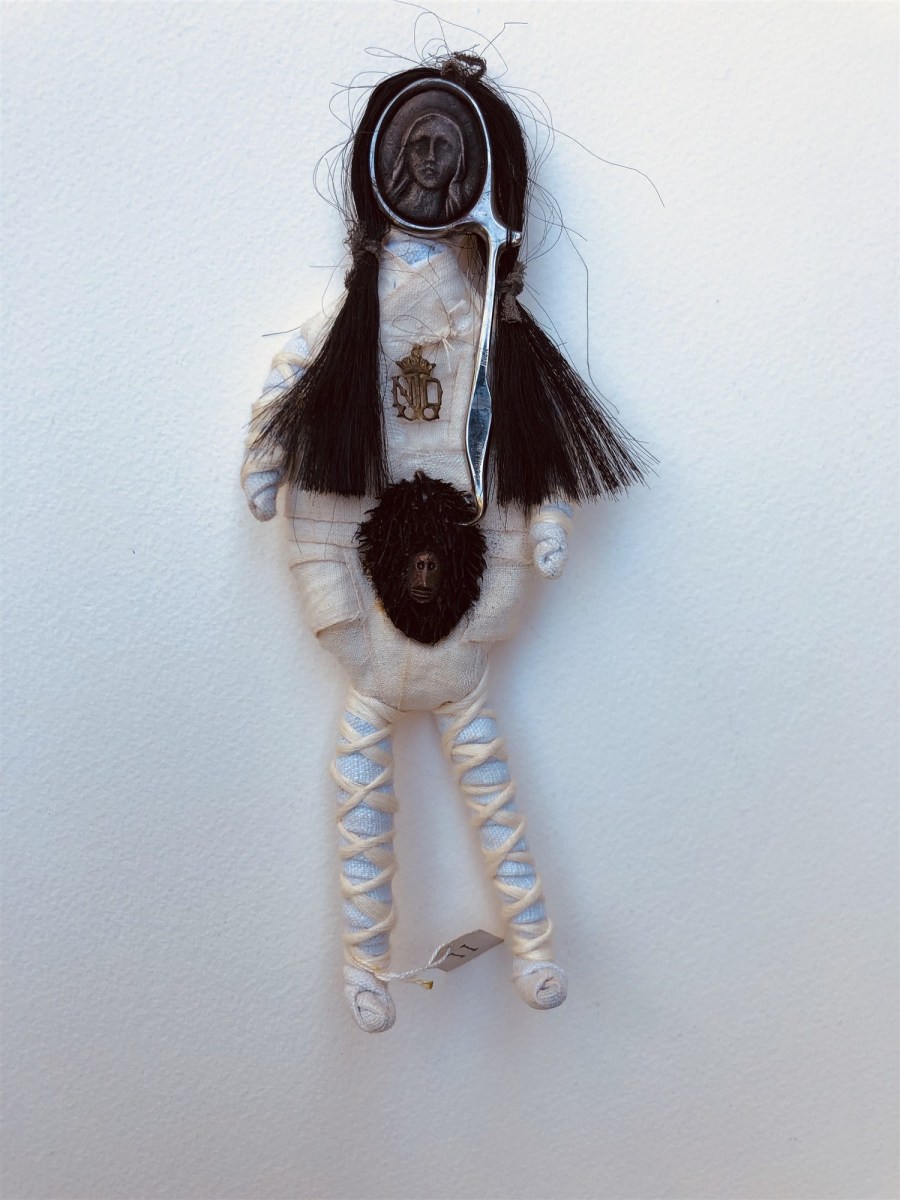POUPEE N° 2 ← Précédent Suivant → POUPÉE N° 2 – Tissus – Cheveux – Médaille – Moitié de ciseau Durillon – Bogue de fruit – 20 cm X 7 cm.