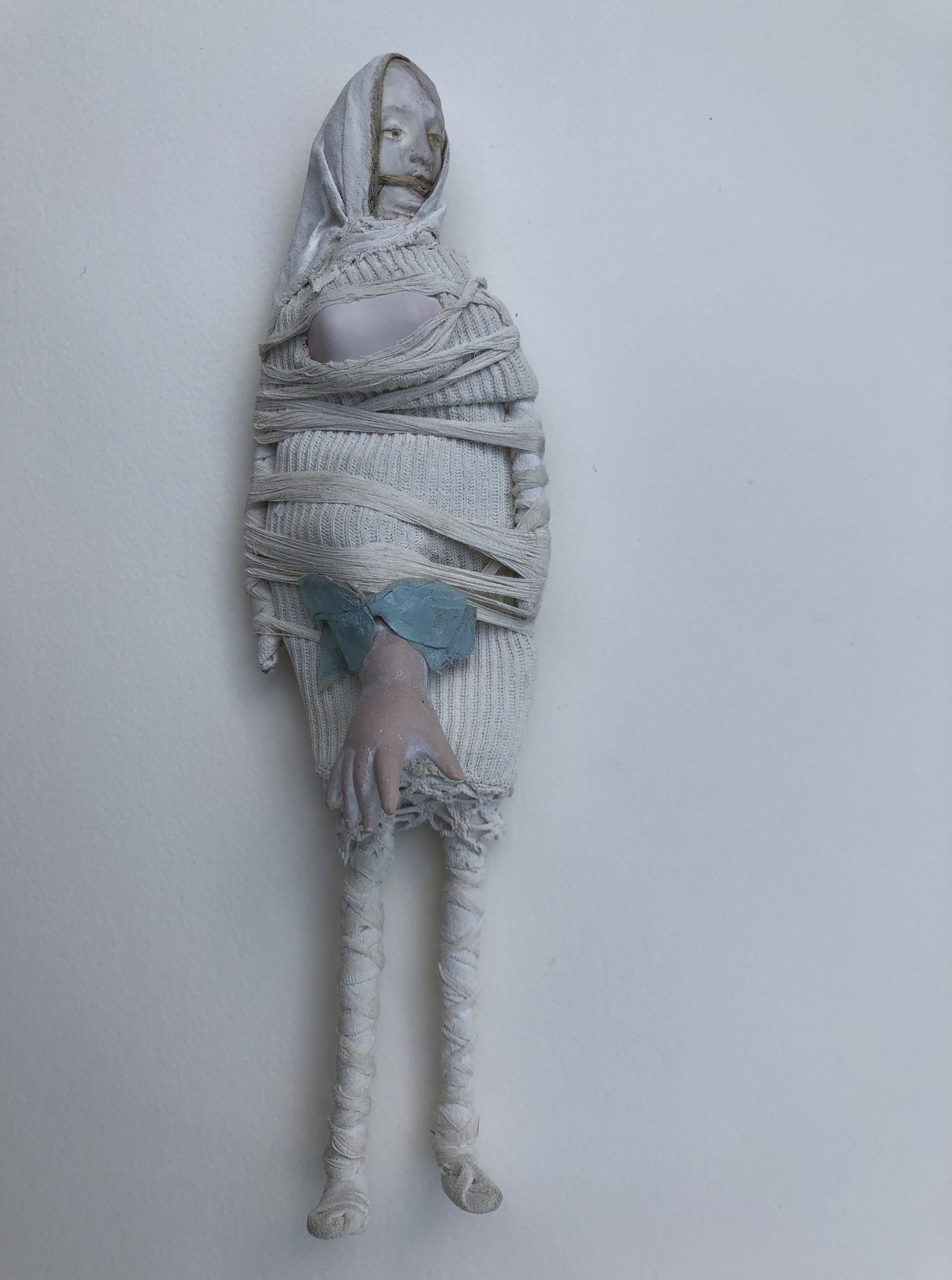 POUPEE N° 20 ← Précédent Suivant → POUPÉE N° 20 – Tissus – Tête et main en céramique – Ficelles – 26cm X 8 cm.