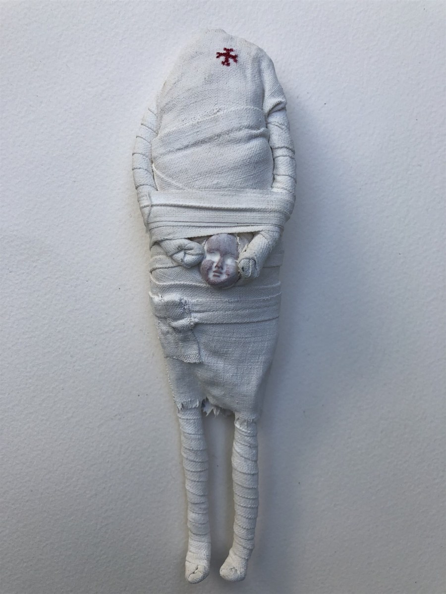 POUPÉE N° 25 – Tissus – Tête céramique – 22 cm X 7 cm.