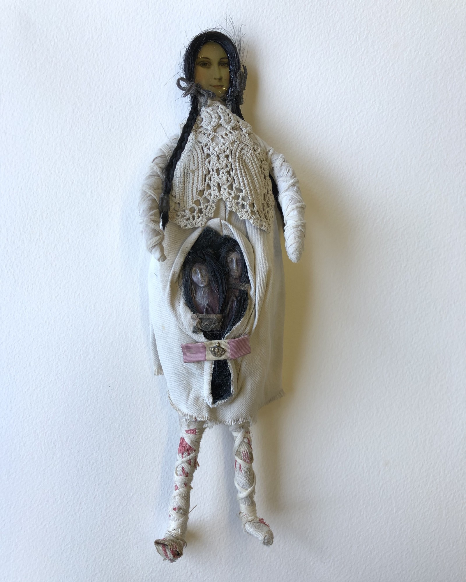 POUPEE N° 3 ← Précédent Suivant → POUPÉE N° 3 – Tissus – Chromo – Céramiques – Broche – Cheveux – Petit châle en crochet – 5 boutons rose – 29 cm X 9,5 cm.