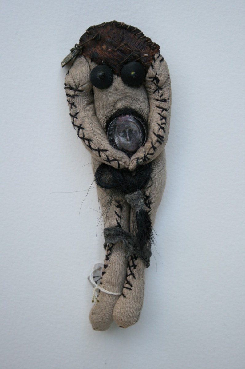 POUPEE N° 33 ← Précédent Suivant → POUPÉE N° 33 – Tissus – Cuir – Médaille – Tête céramique – Cheveux – 15 cm X 5,5 cm.